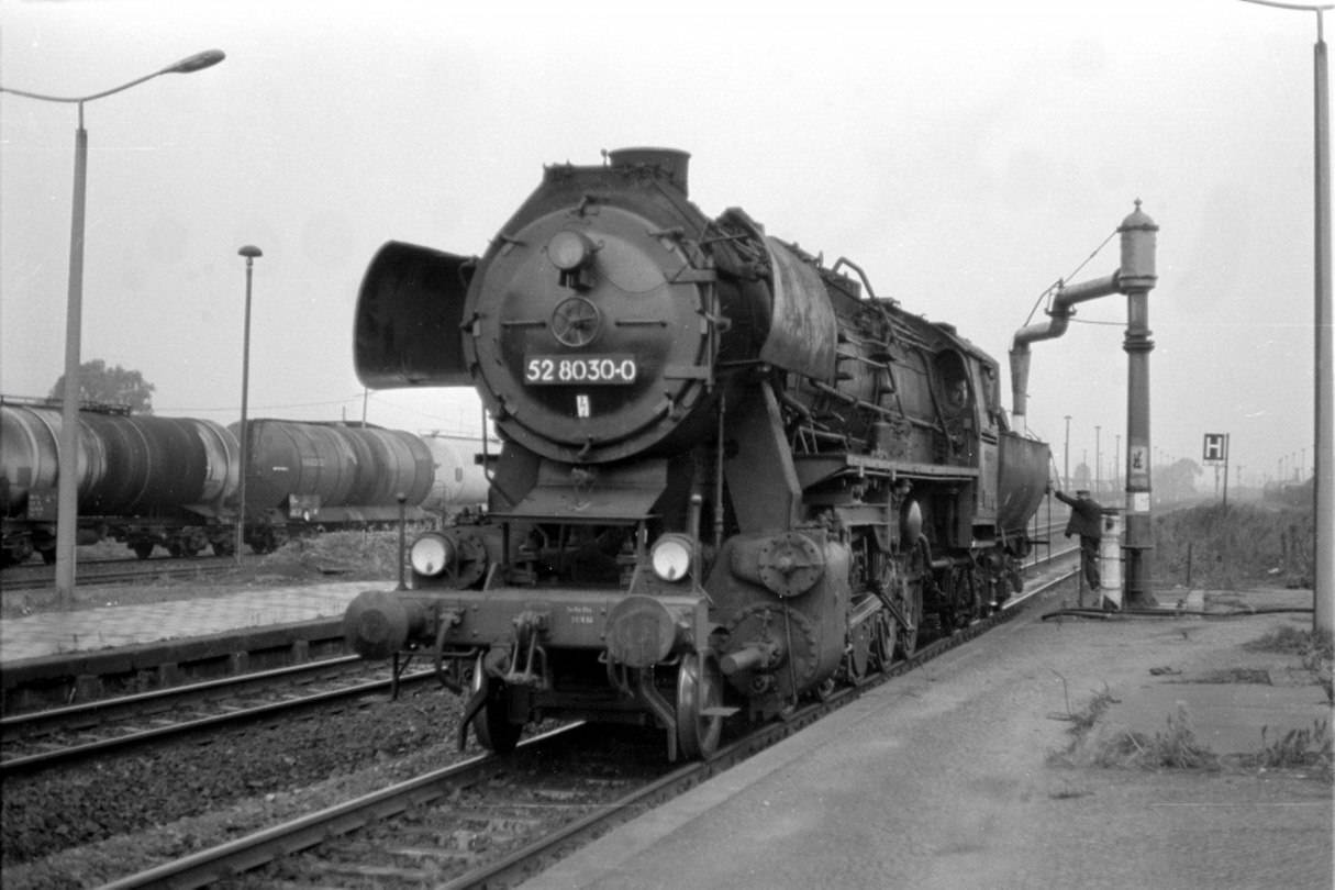 RAW frisch präsentierte sich 52 8030 am Wasserkran des Bf Angermünde Okt 84