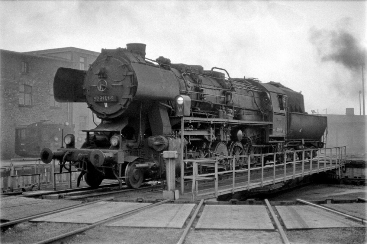 52 8141 auf der Drehscheibe im Heimat Bw Angermünde Juli 84