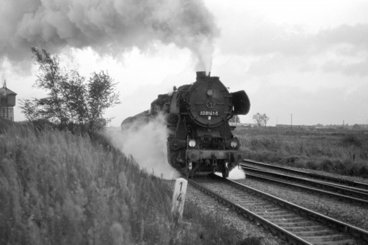 52 8141 fährt mit Gz am Bw vorbei nach Tantow Juli 84