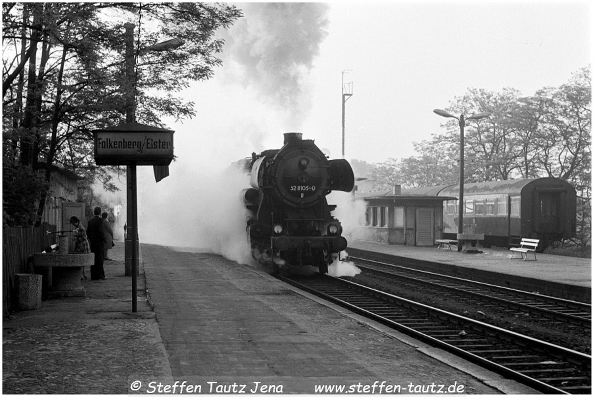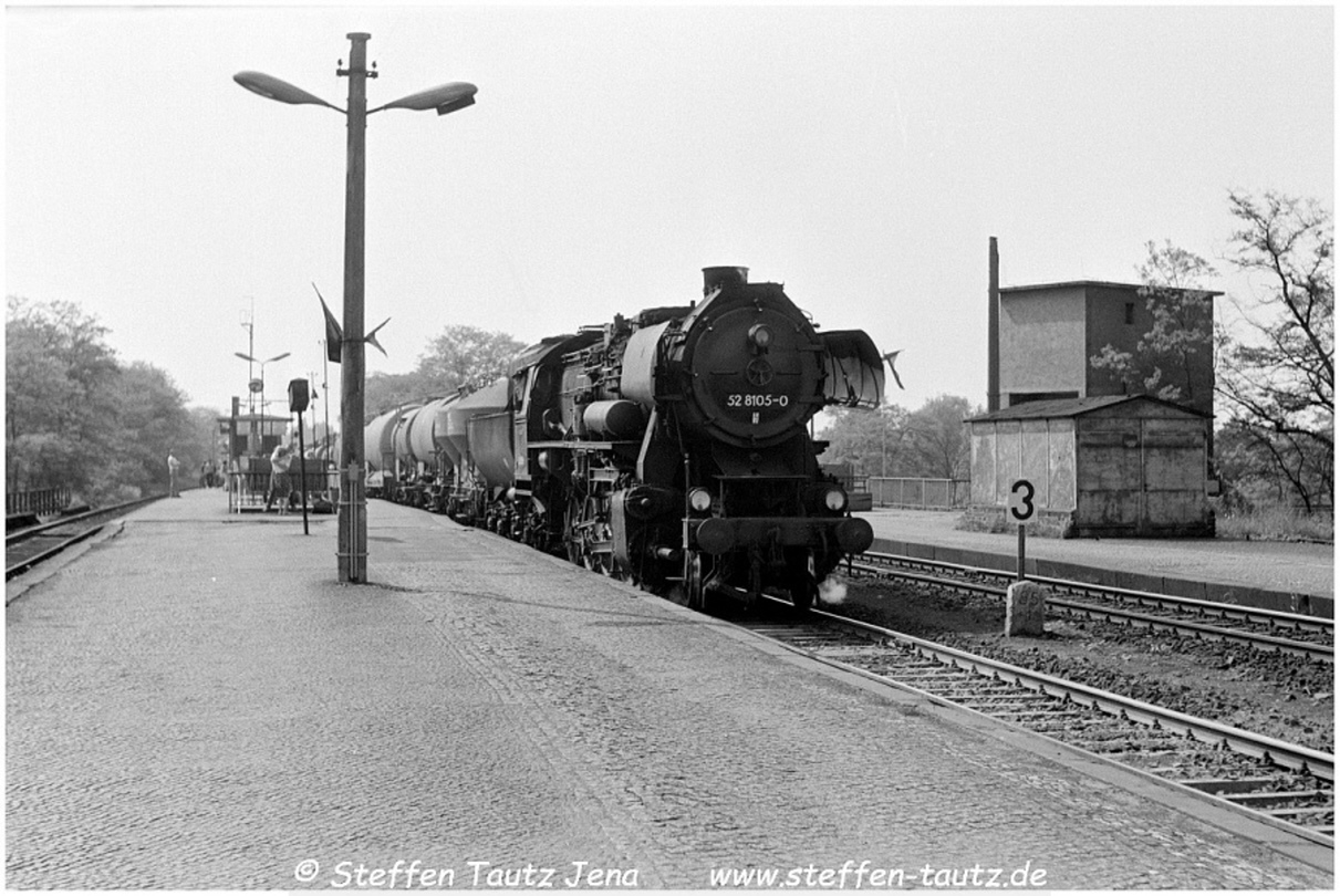 Am Nachmittag kommt 52 8105 aus Eilenburg zurück und durchfährt hier den oberen Personenbahnhof Falkenberg Mai 85