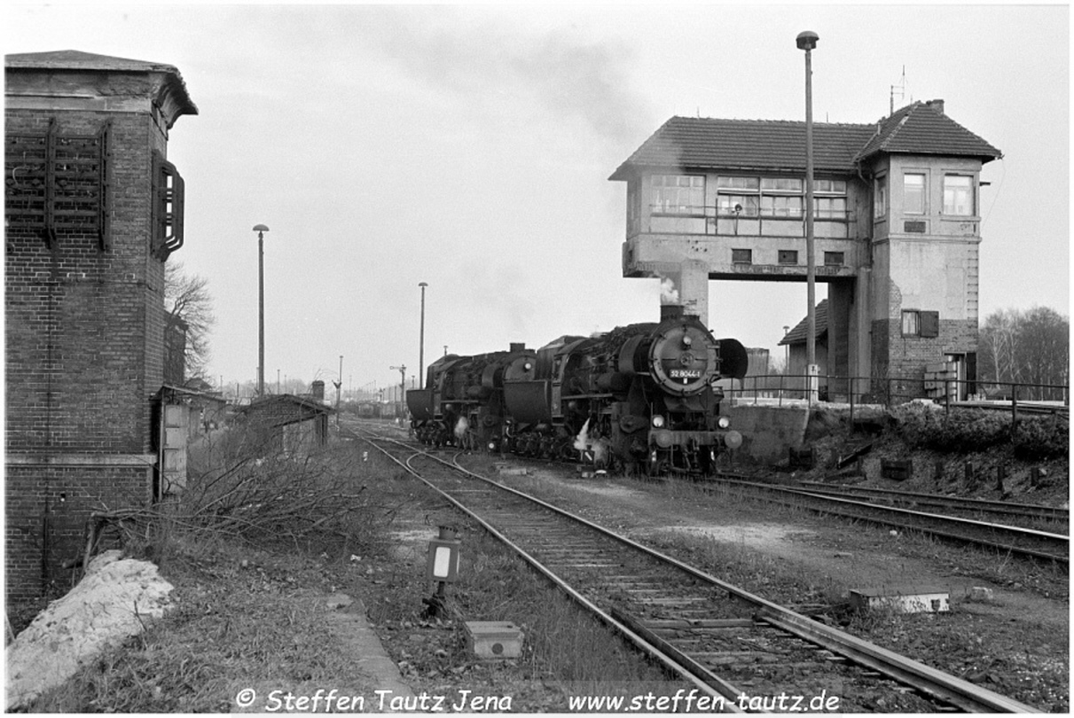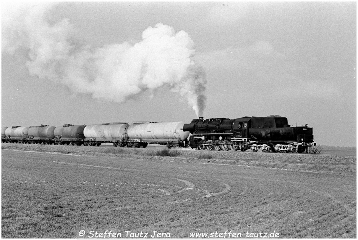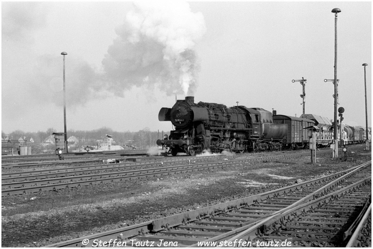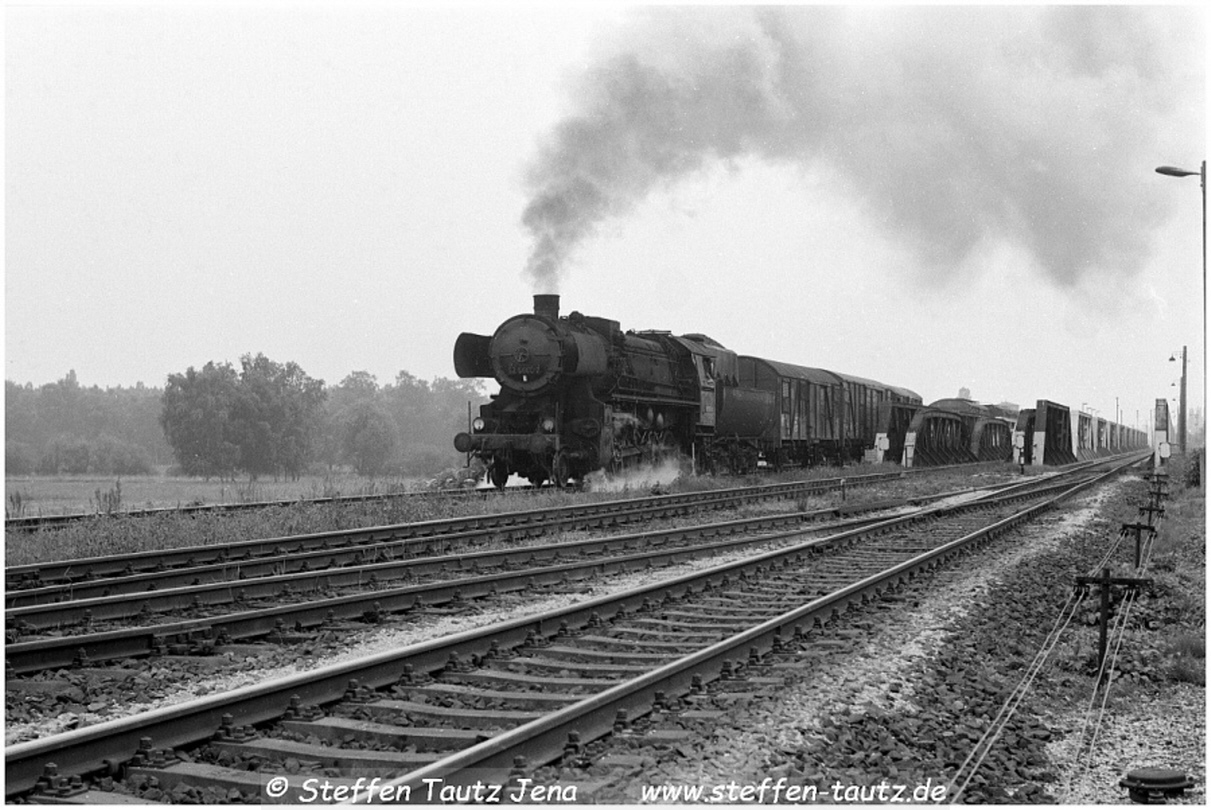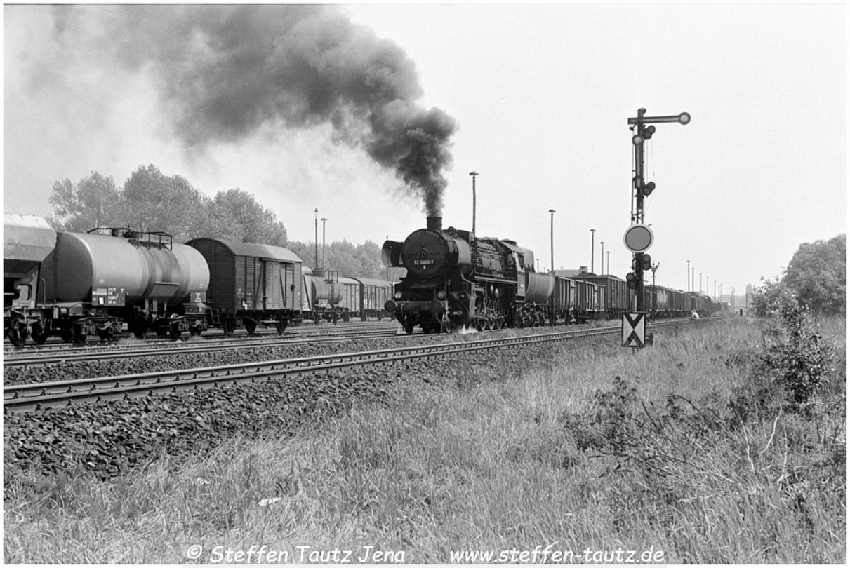 Hier verlässt 52 5660 mit Nahgüterzug nach Eilenburg den oberen Güterbahnhof Falkenberg Mai 85