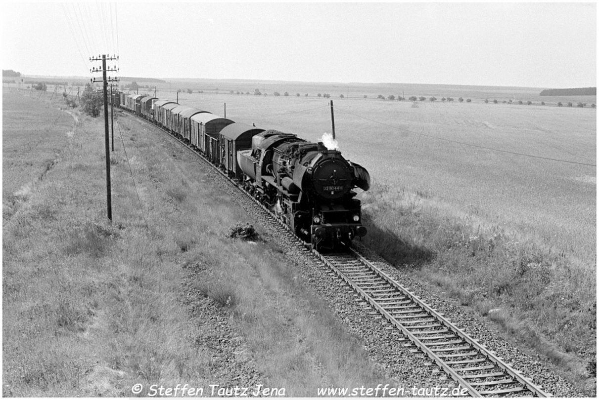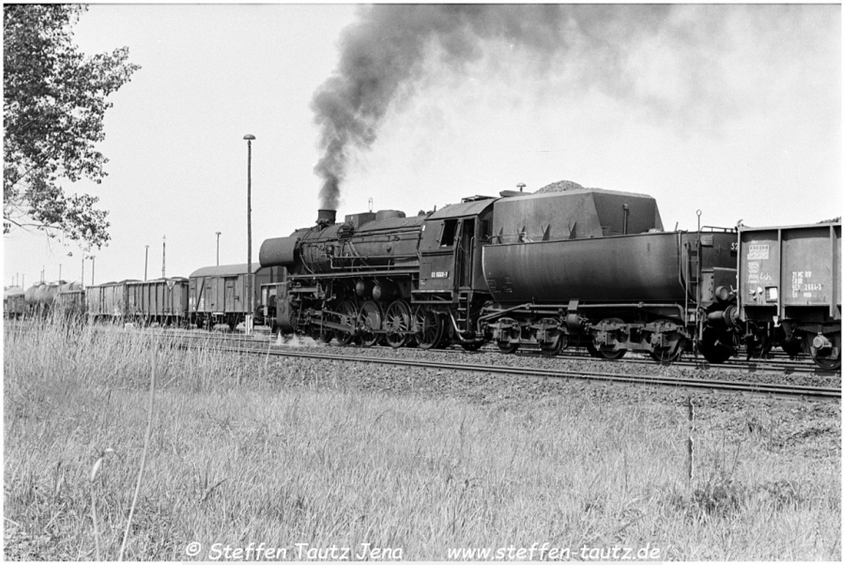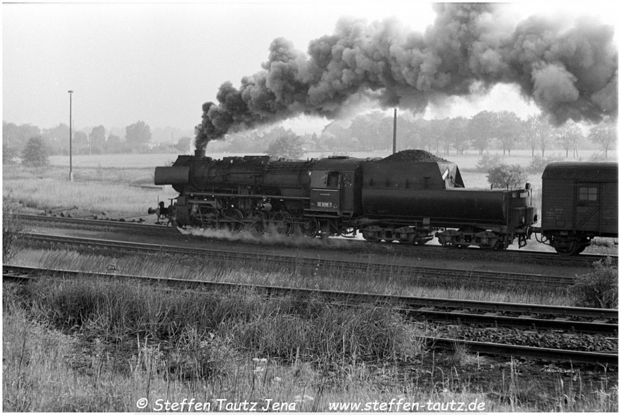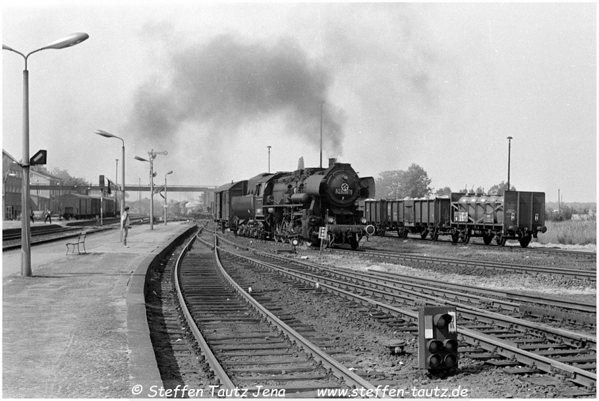 52 5448 kommt ohne Rauchkammerlokschild mit dem Nahgüterzug aus Eilenburg in Falkenberg an Juli 85