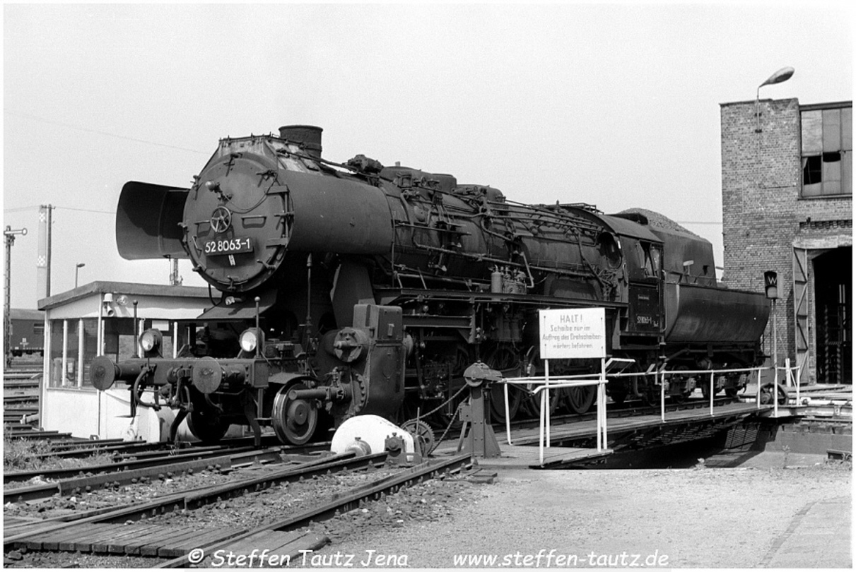 52 8063 war die Planlok der Est Eilenburg, welche mit einem Nahgüterzug die Strecke nach Wurzen bediente. Hier auf der Drehscheibe im Heimat Bw Mai 85