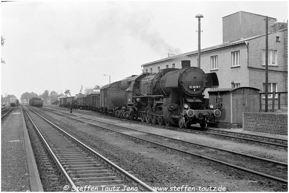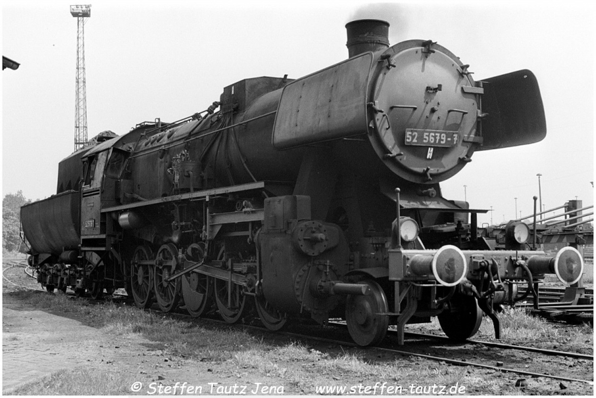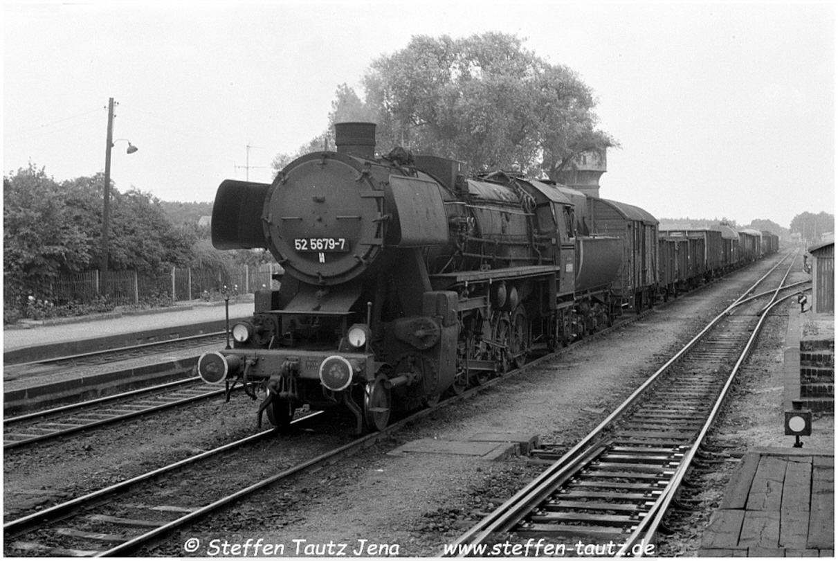 Nach drei Versuchen klappte es nun endlich, 52 5679 vor einem Zug zu sehen, hier rangiert sie in Holzdorf/Elster Juli 85