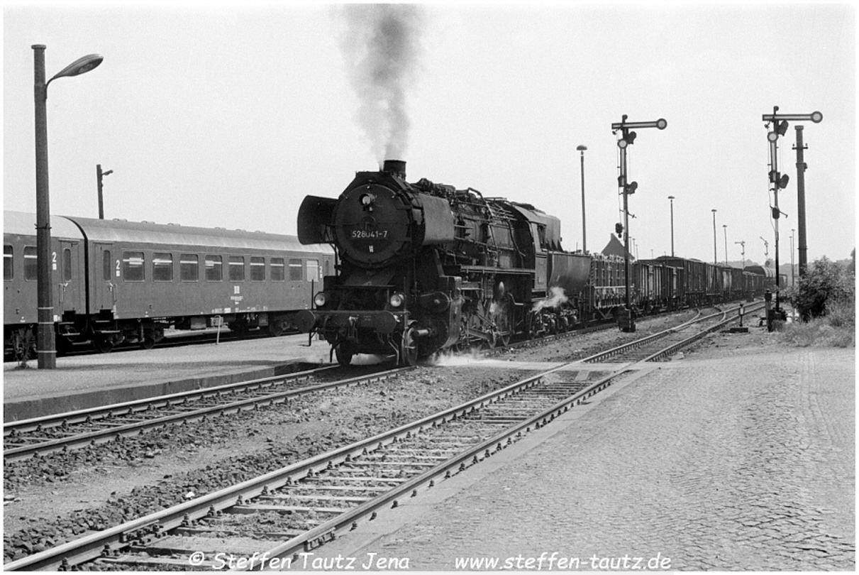 52 8041 ist auf dem Weg nach Eilenburg und hat den oberen Personenbahnhof Falkenberg erreicht Juli 85