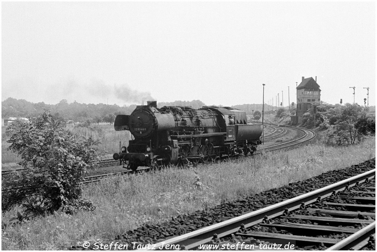 Auch 52 8044 ist mit dem Mittagszug nach Eilenburg auf dem Weg im oberen Personenbahnhof Falkenberg Juli 85