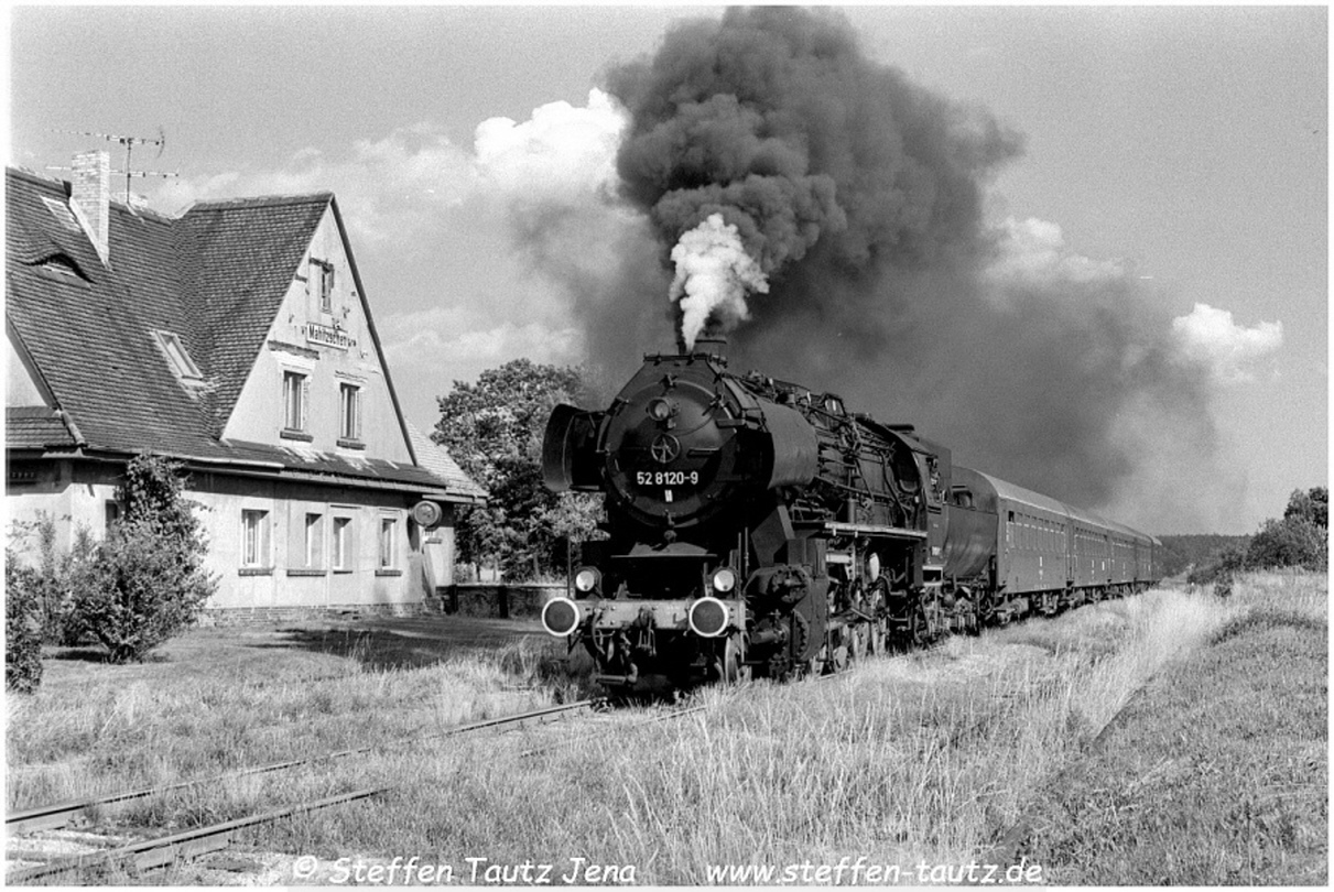 52 8120 passiert den Bahnhof Pflückuff kurz vor Torgau Aug 90