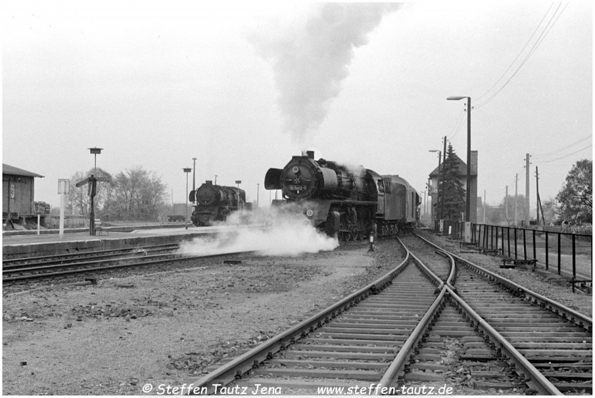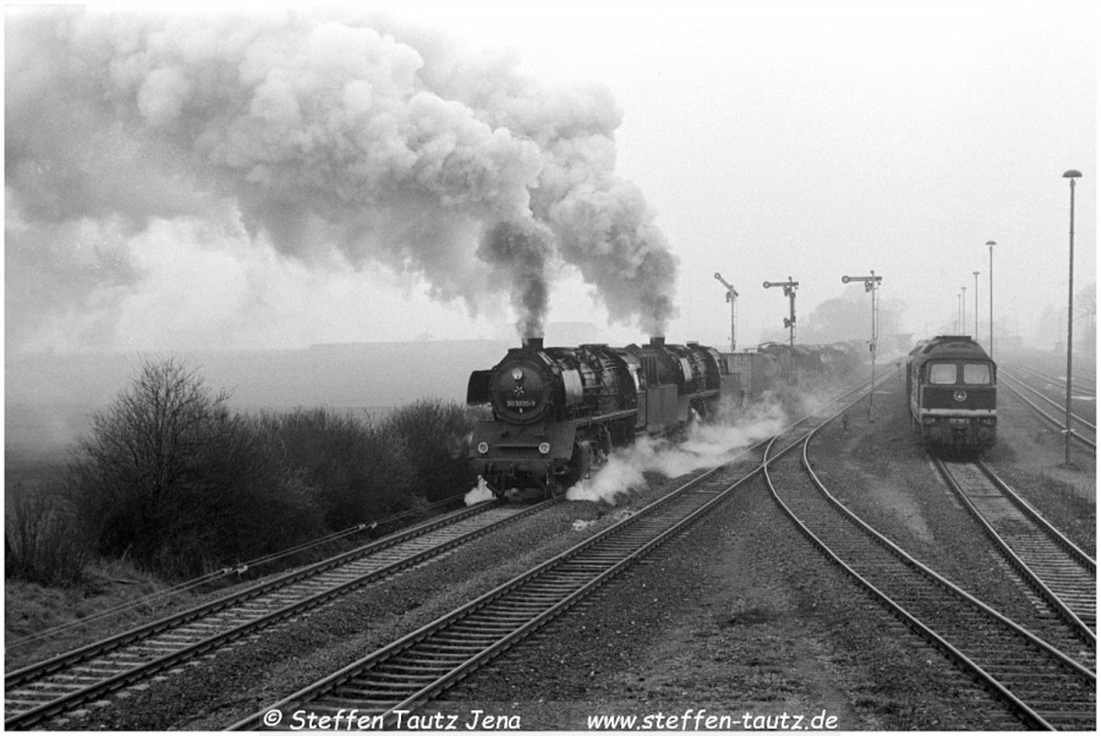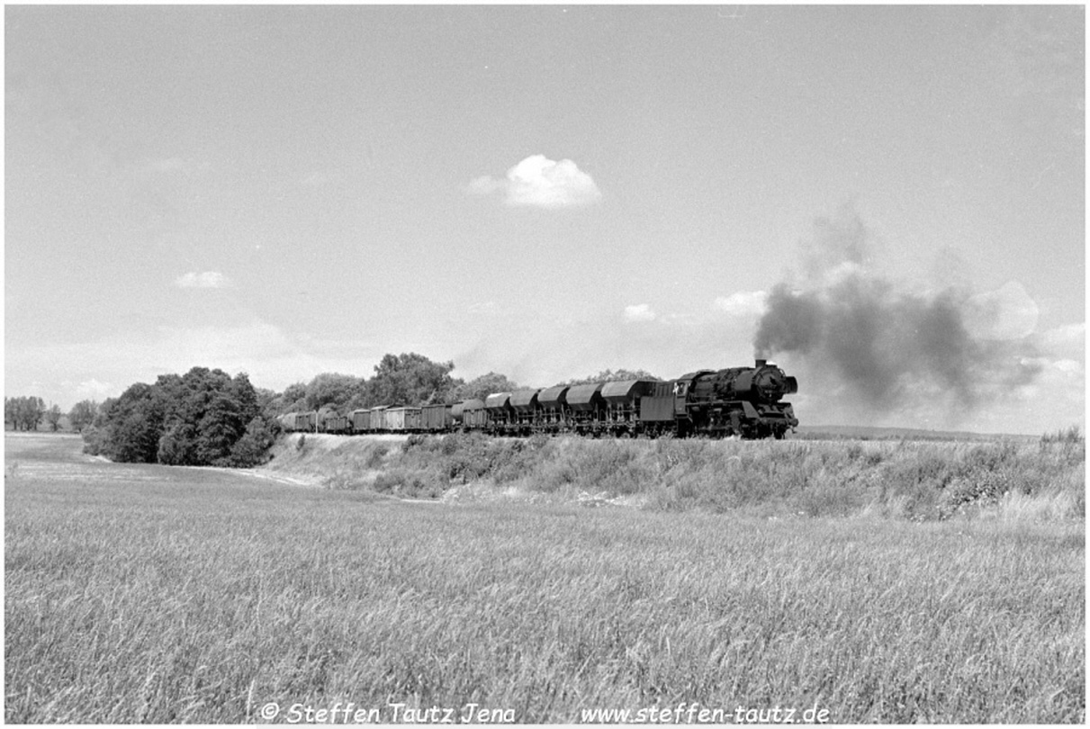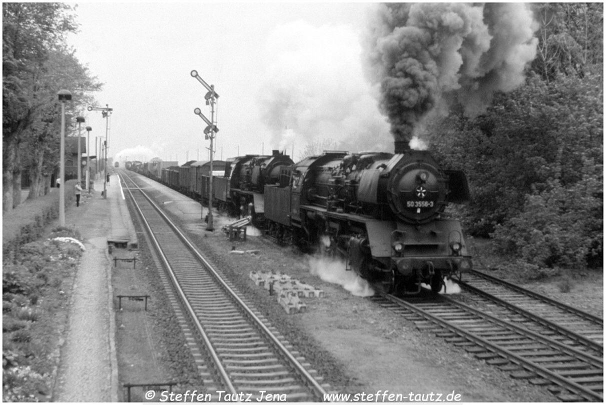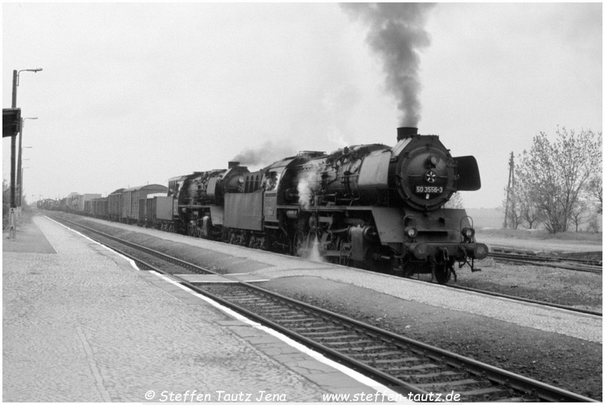 Großes Finale in Dittfurt, 50 3556 und 50 3520 mit Ng 61792 wartet auf die Kreuzung mit P 19413 Mai 86