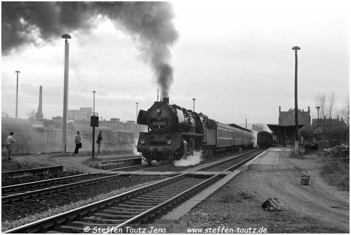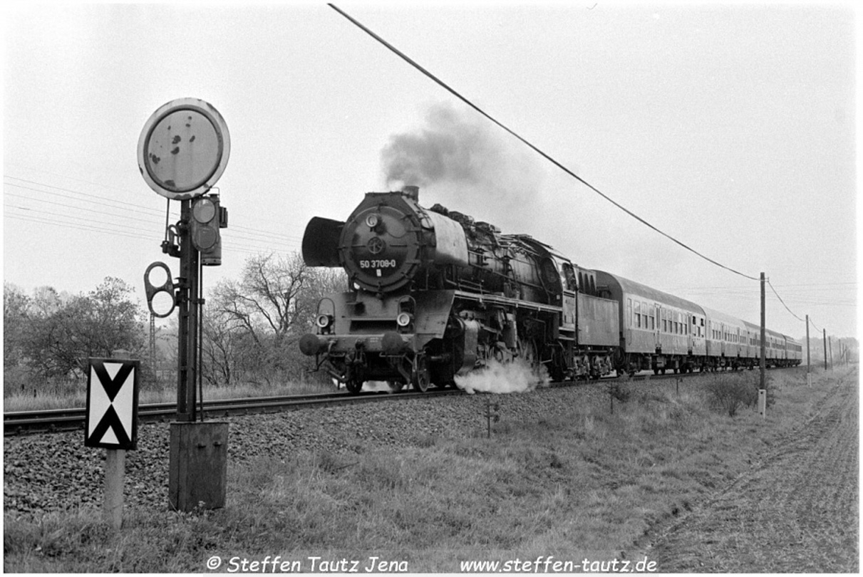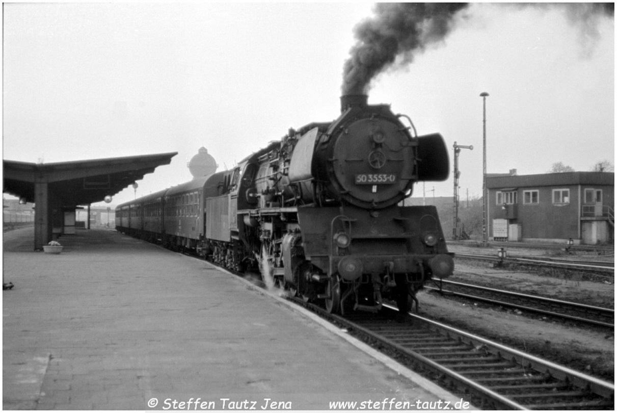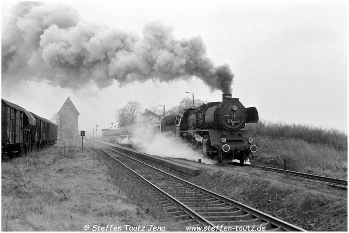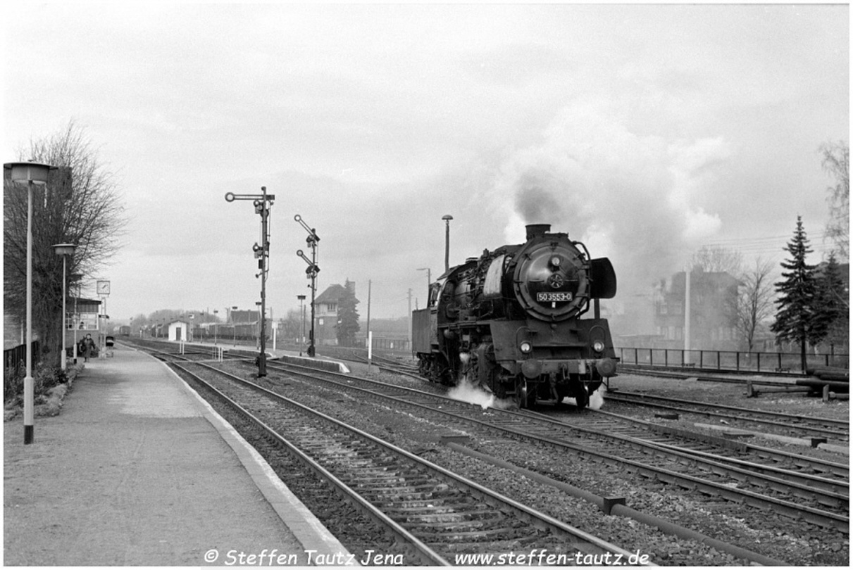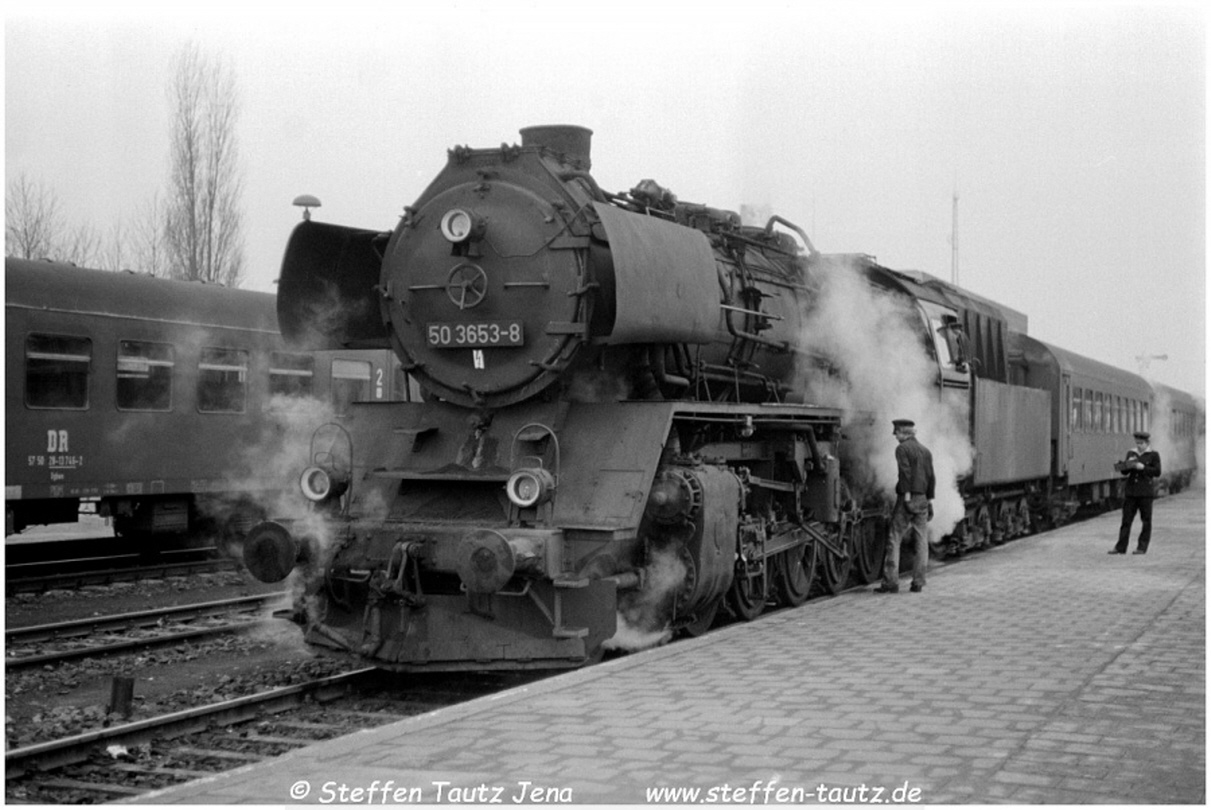 Im März 84 ist 50 3653 vorm Ascherslebener P-Zug in Halberstadt