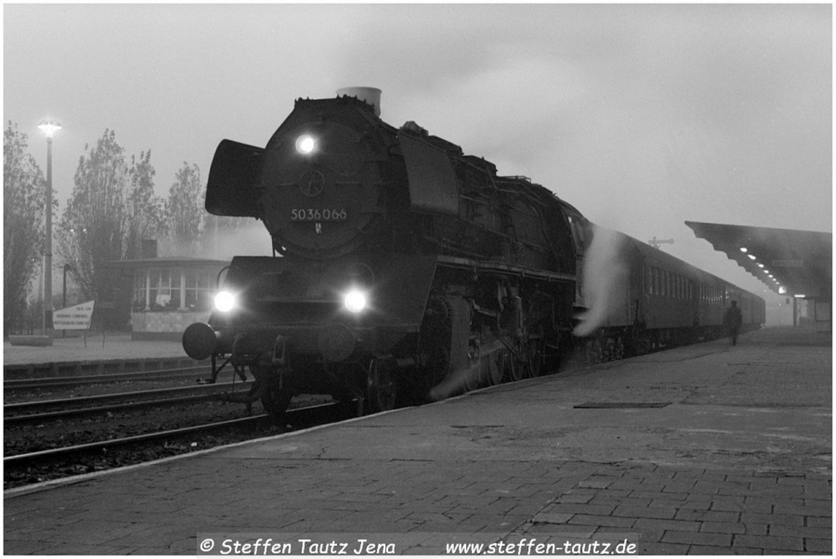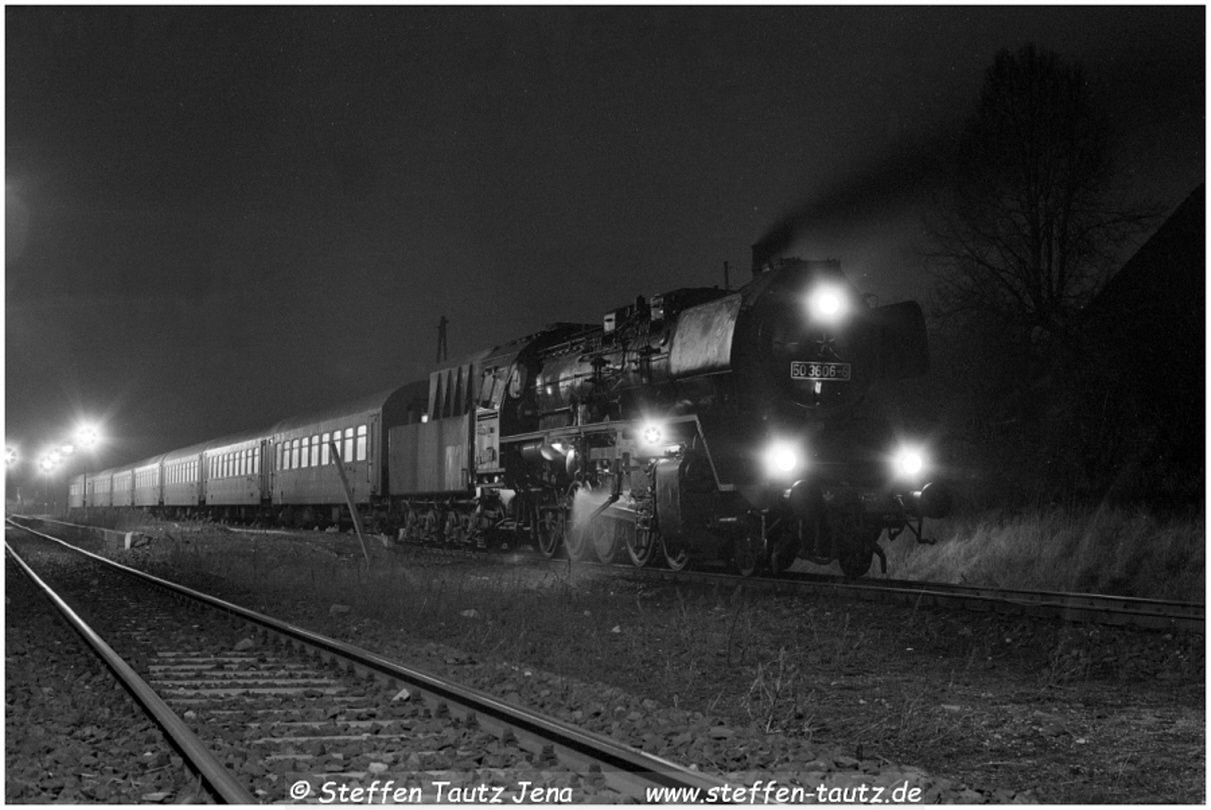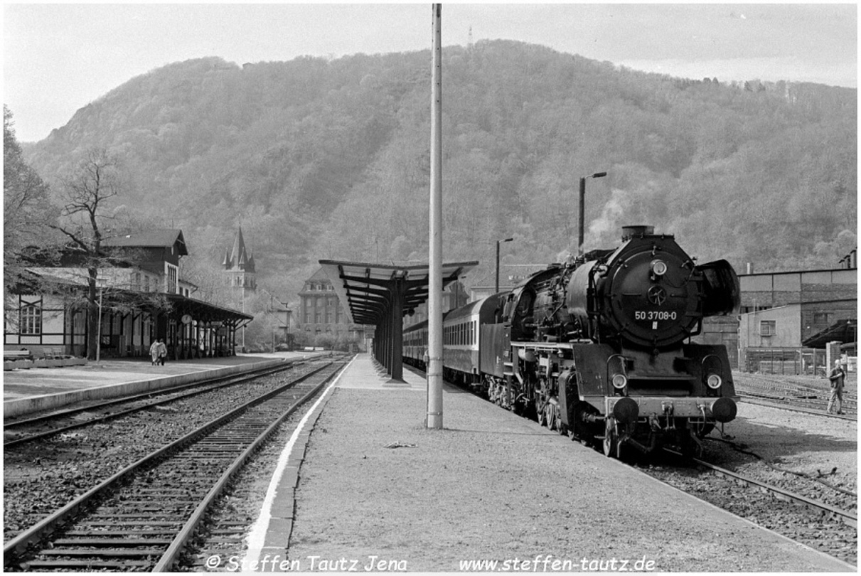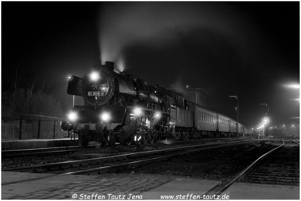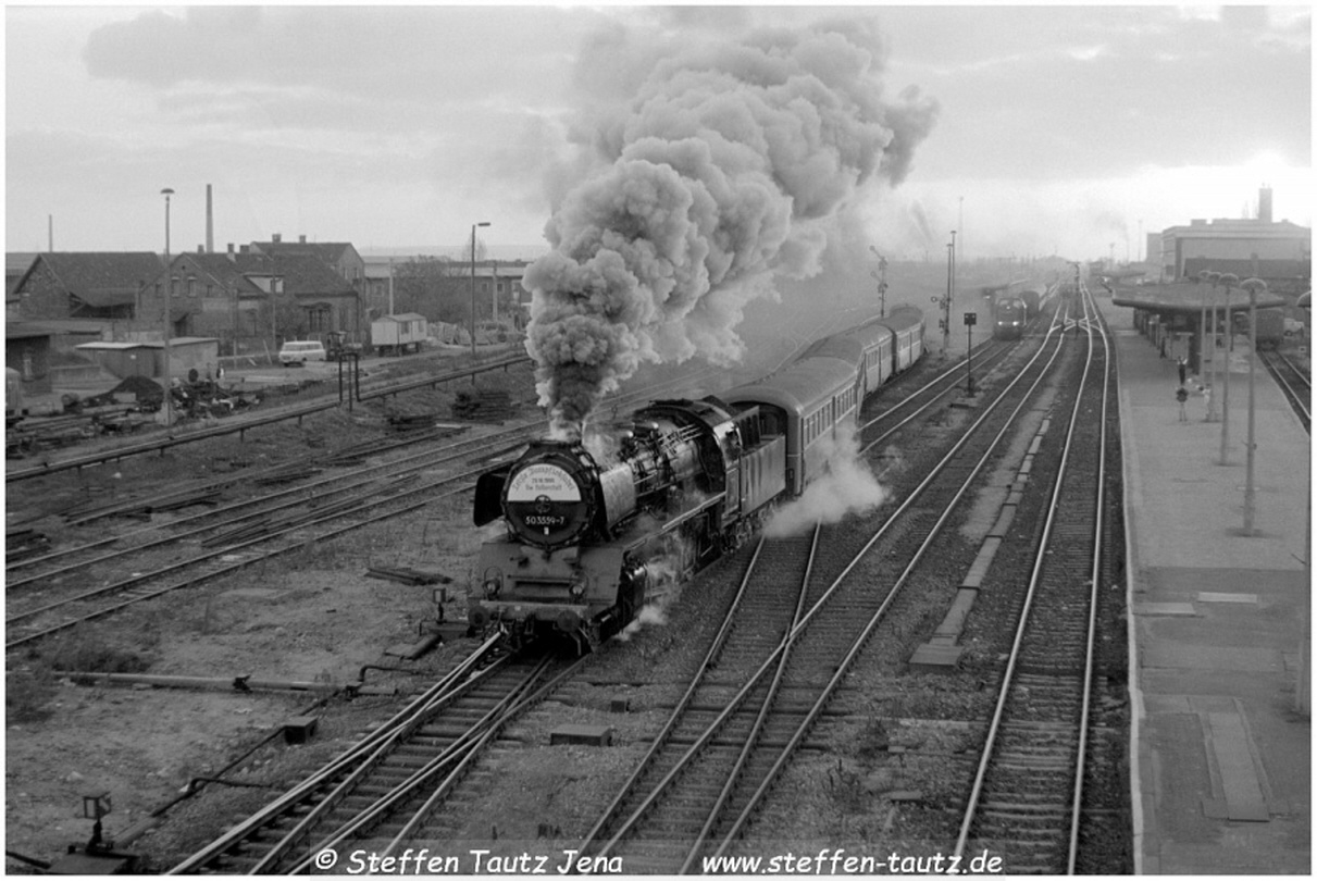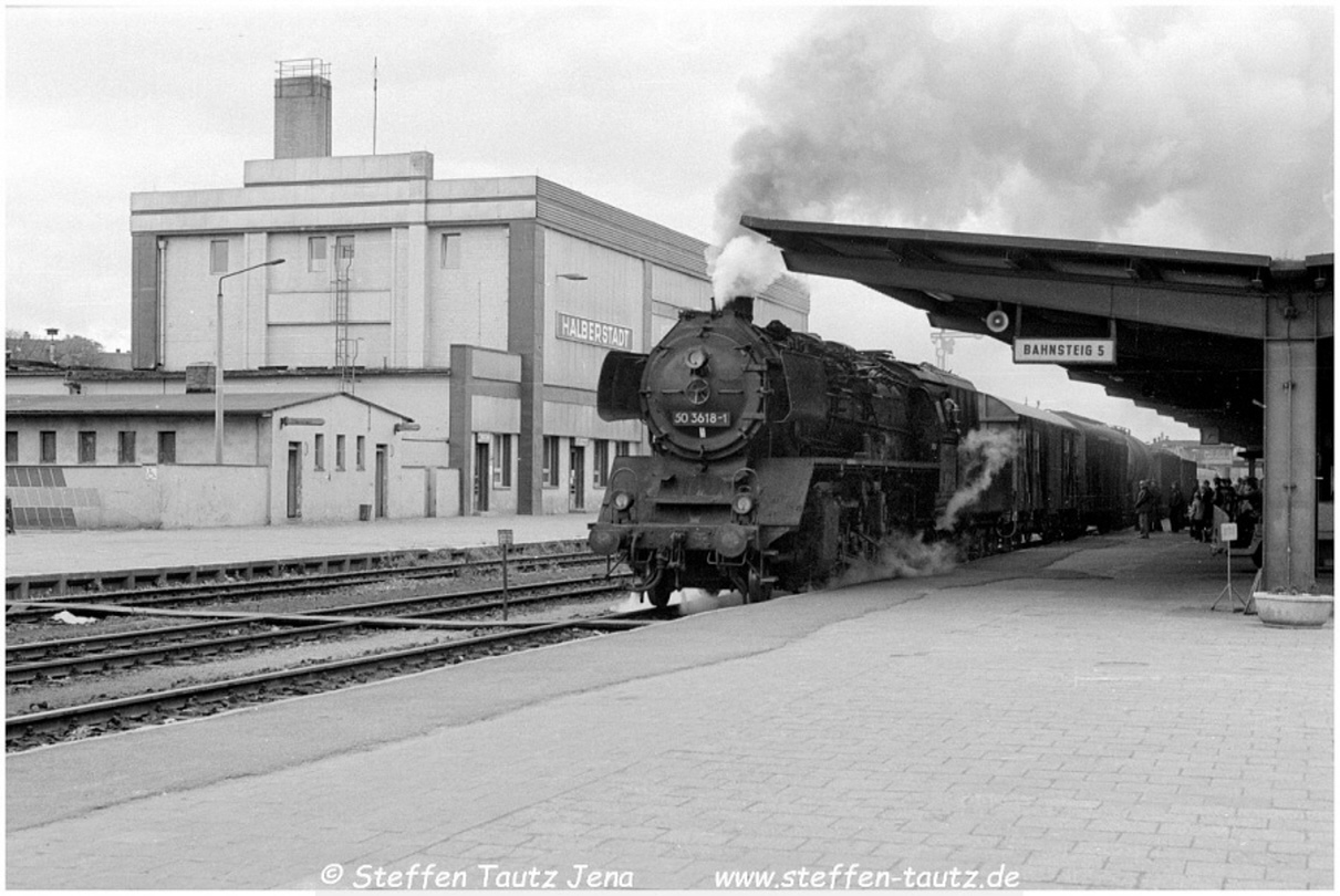 P 19413 mit 50 3606 bei Ausfahrt Quedlinburg. Herrenlose Gepäckstücke auf dem Bahnsteig führen heute zur Sperrung des ganzen Bahnhof Dez 87