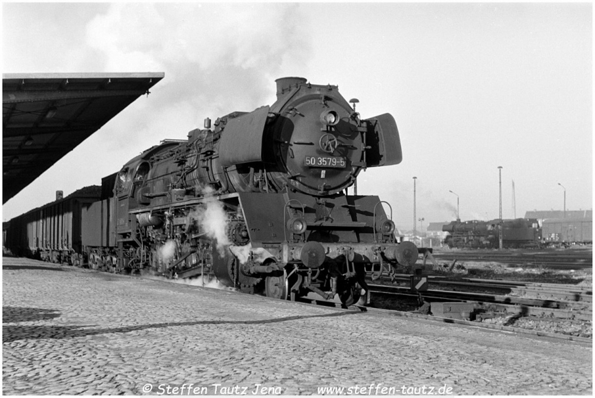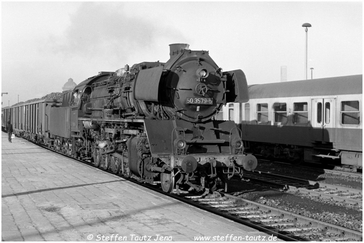 50 3653 durchfährt im Oktober 83 mit dem Kohleganzzug nach Blankenburg den Personenbahnhof Halberstadt