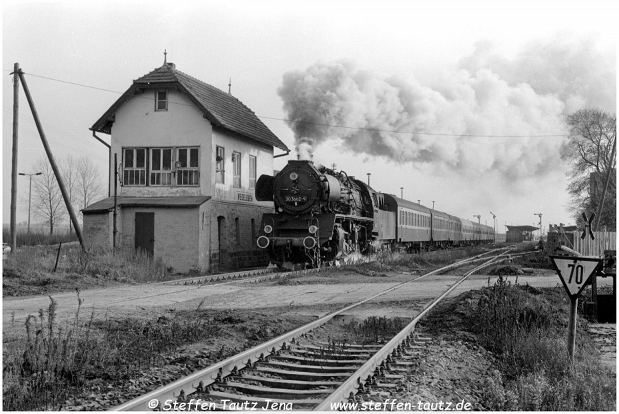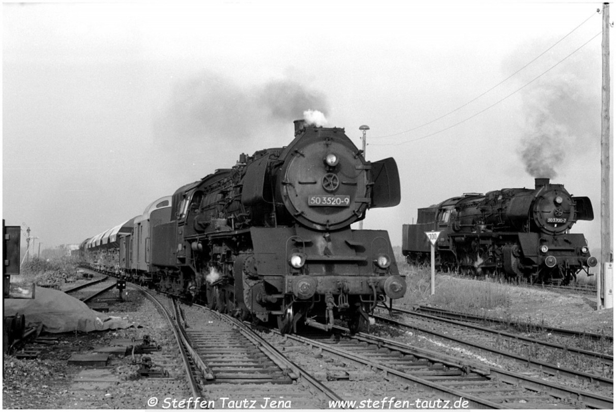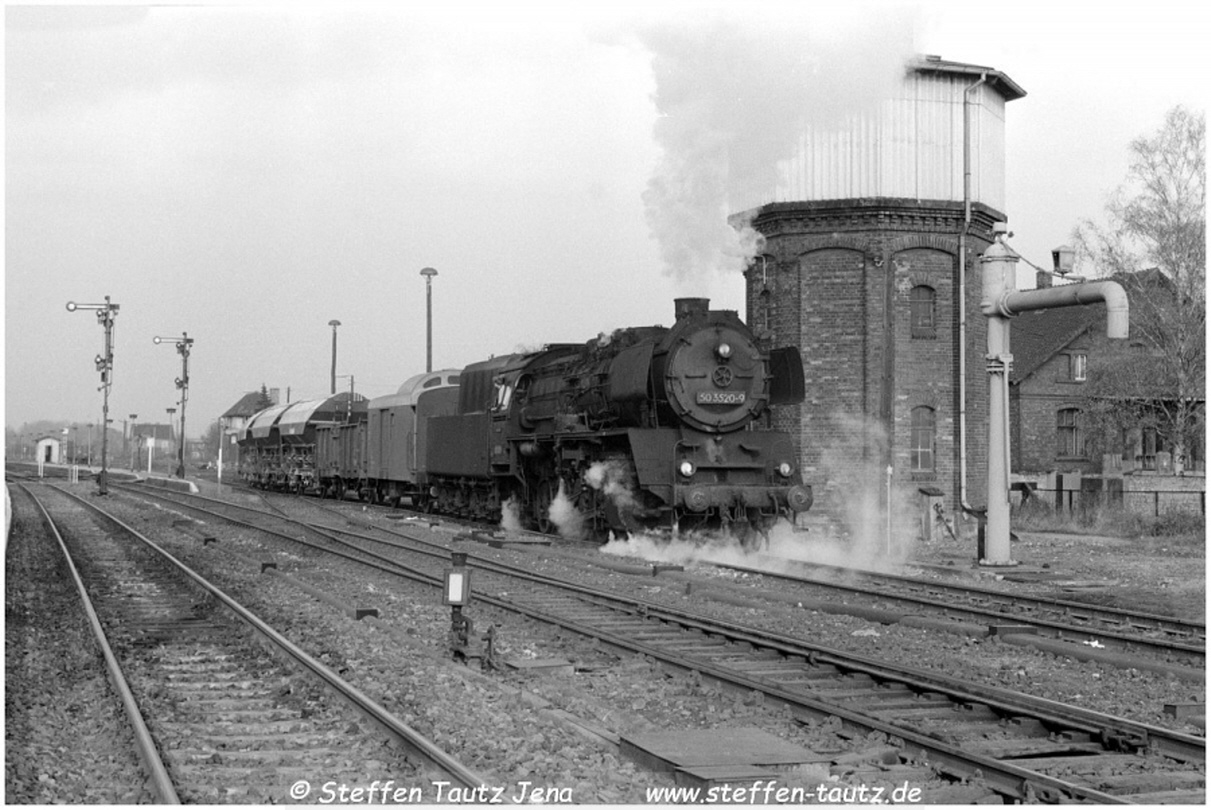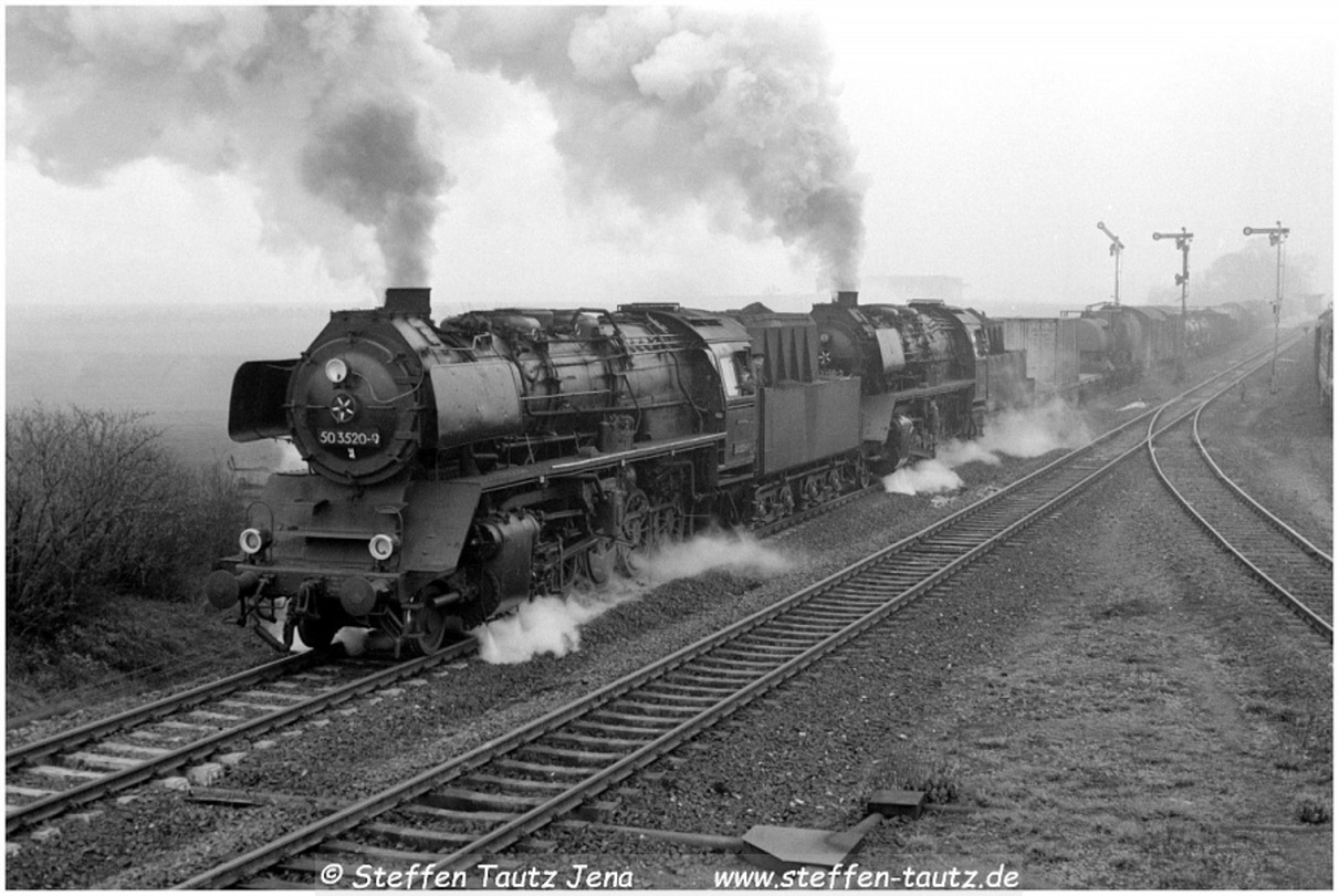 Blick vom Stellwerk Wegeleben auf den Ng 61792 mit 50 3520 und 50 3556. Der Halt am A-Sig wurde von mir gewünscht und vom Stellwerker umgesetzt. Apr 86