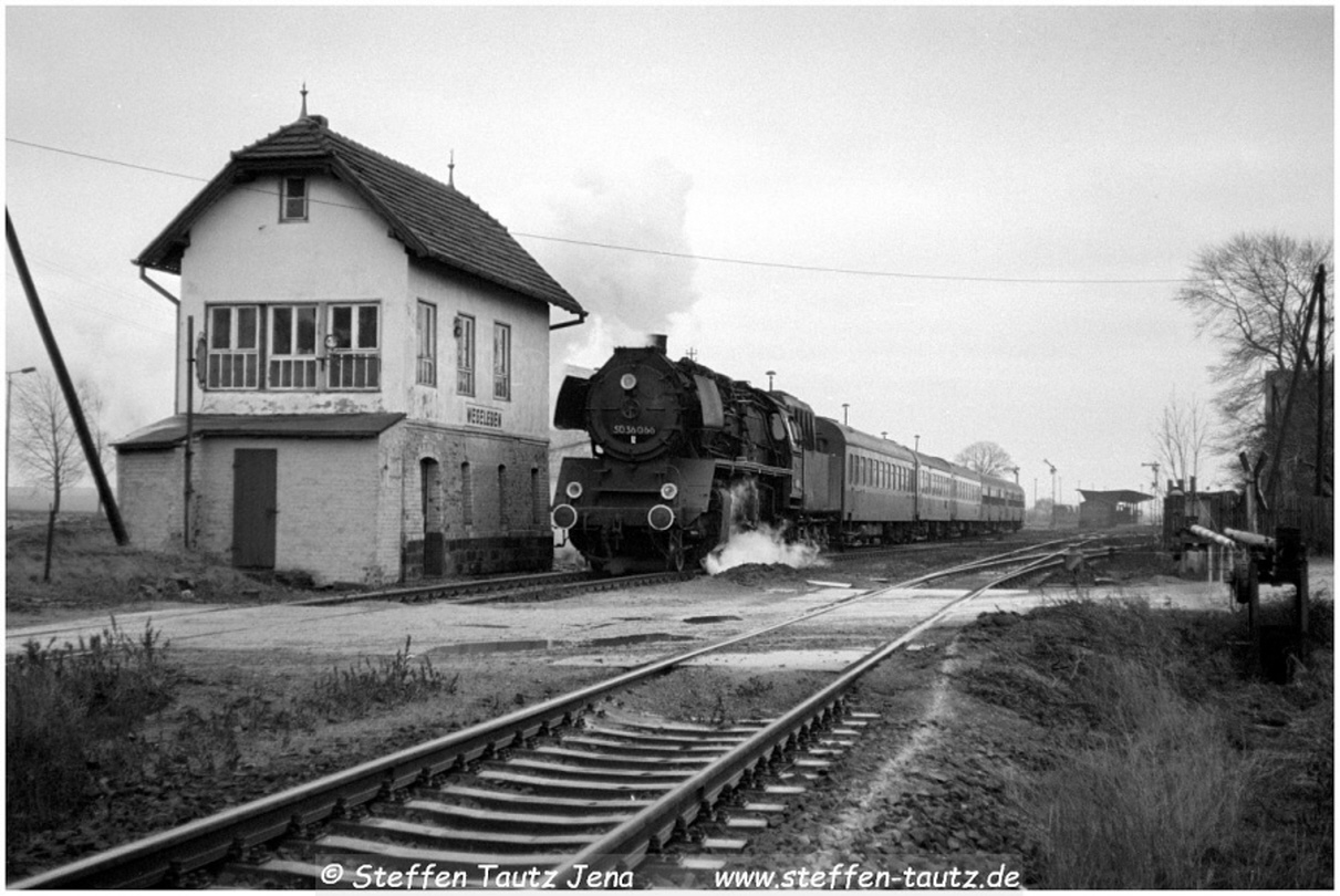 50 3553 kommt mit dem P 19413 aus Thale zurück, hier in Wegeleben Apr86