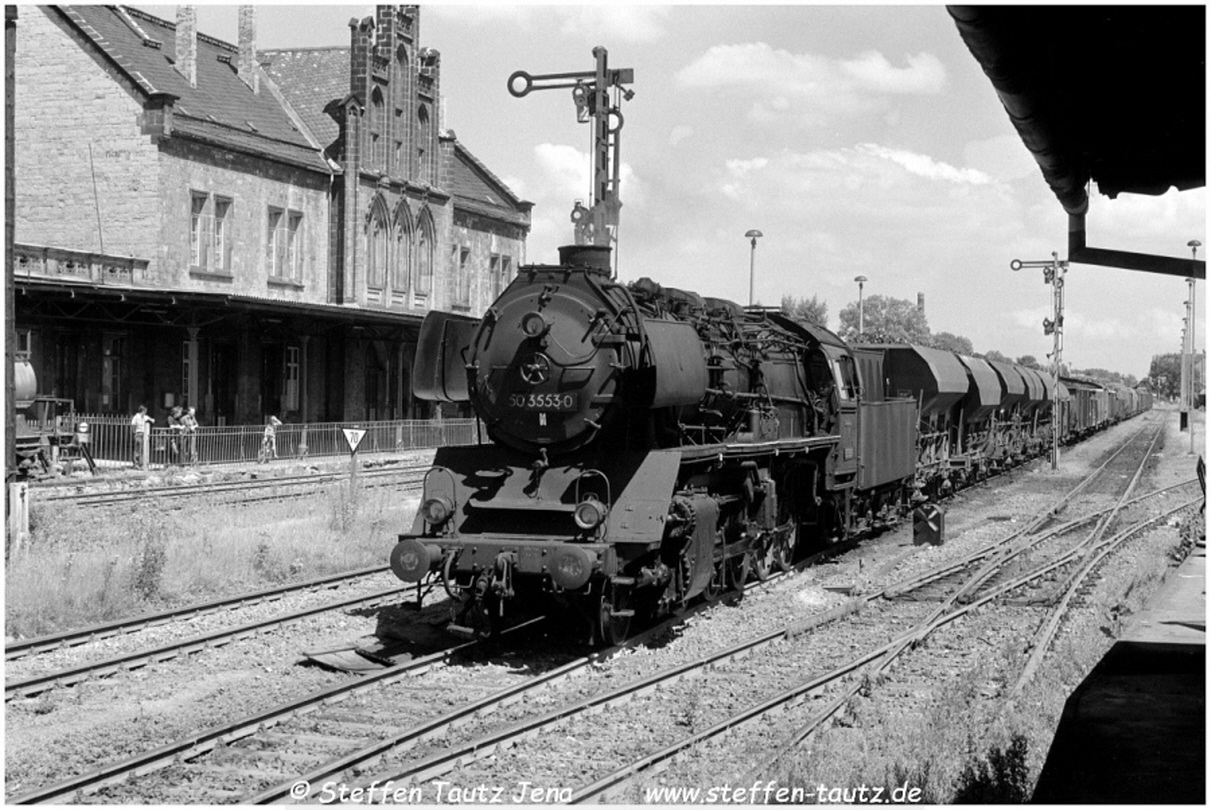 Mit P 19408 donnert 50 3553 durch den Bahnhof Wegeleben April 86