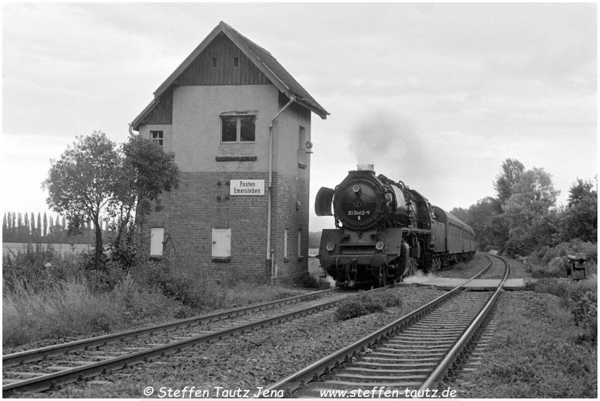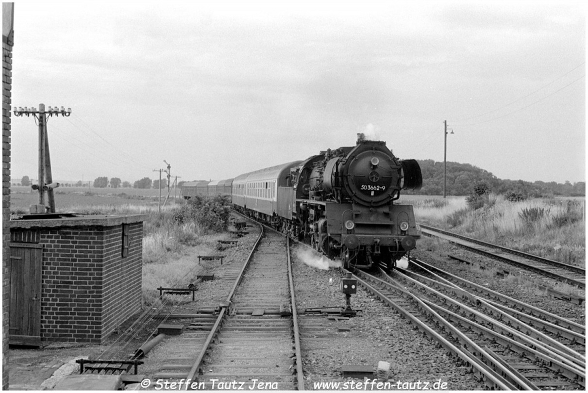 50 3662 ist hier mit dem Arbeiterzug nach Dedeleben unterwegs und verläßt den Bahnhof Badersleben Juli 87