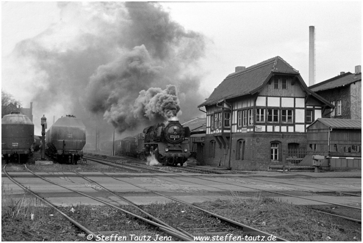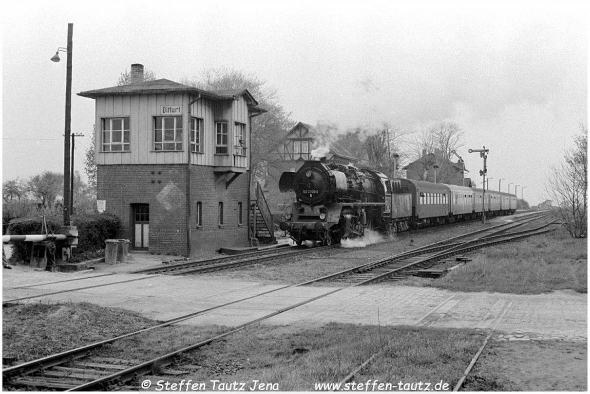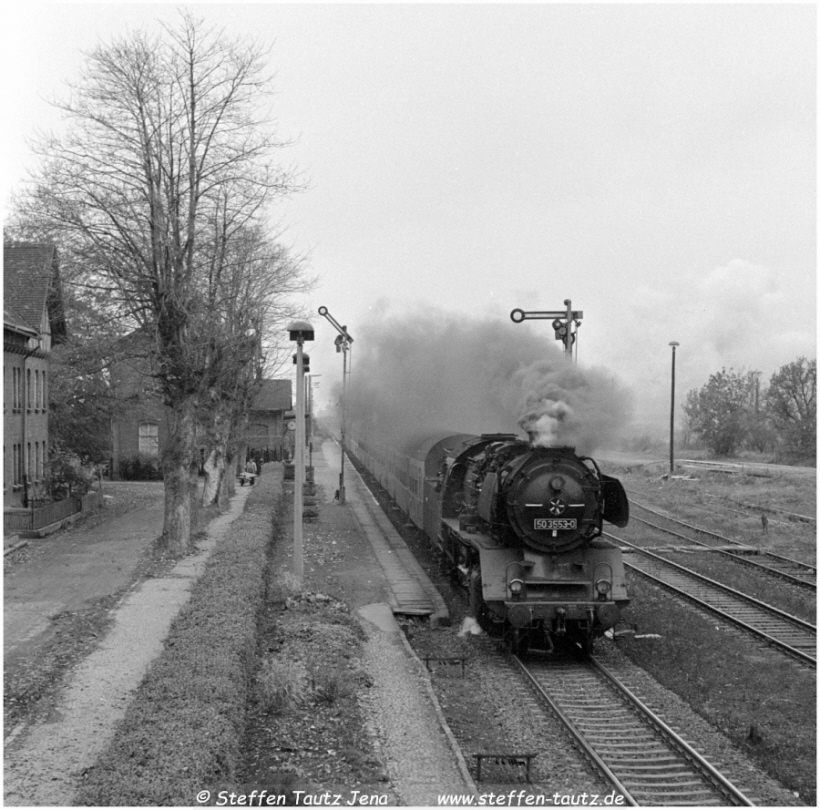 50 3553 passiert den Bahnhof Ditfurt ohne Halt mit P 19408 Blick vom Stellwerk Dez 87