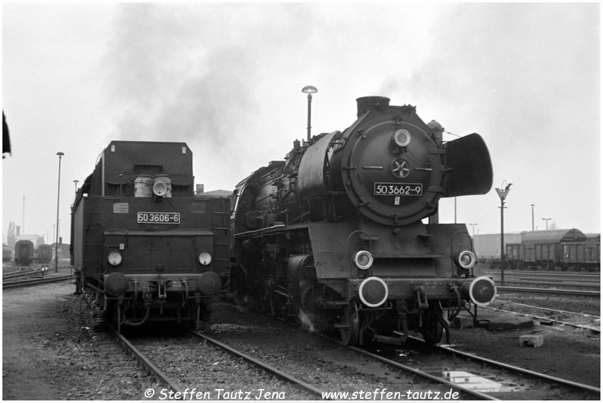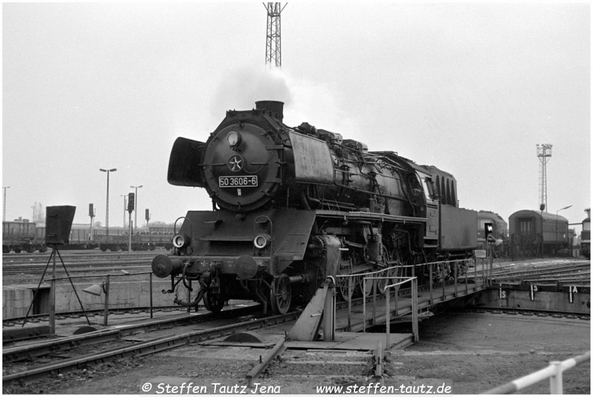 Blick ins Bw Halberstadt 50 3606 und 50 3662 stehen an der Drehscheibe 2 Dez 87