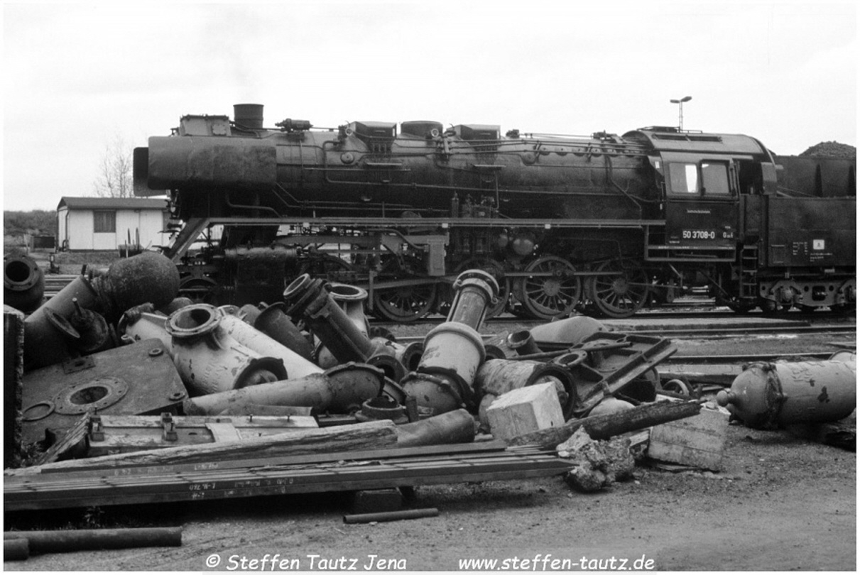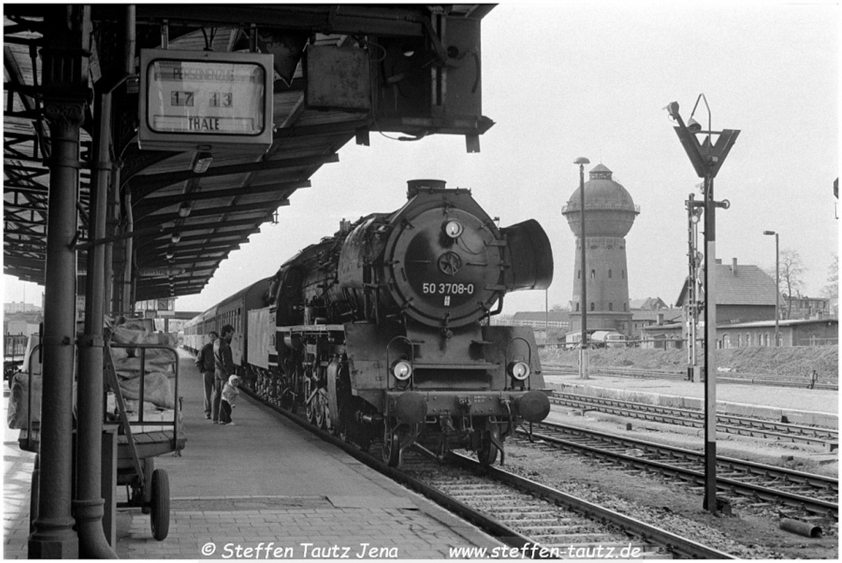 50 3708 macht sich auf die zweite Tour nach Thale bereit. Bahnhof Halberstadt Apr 90