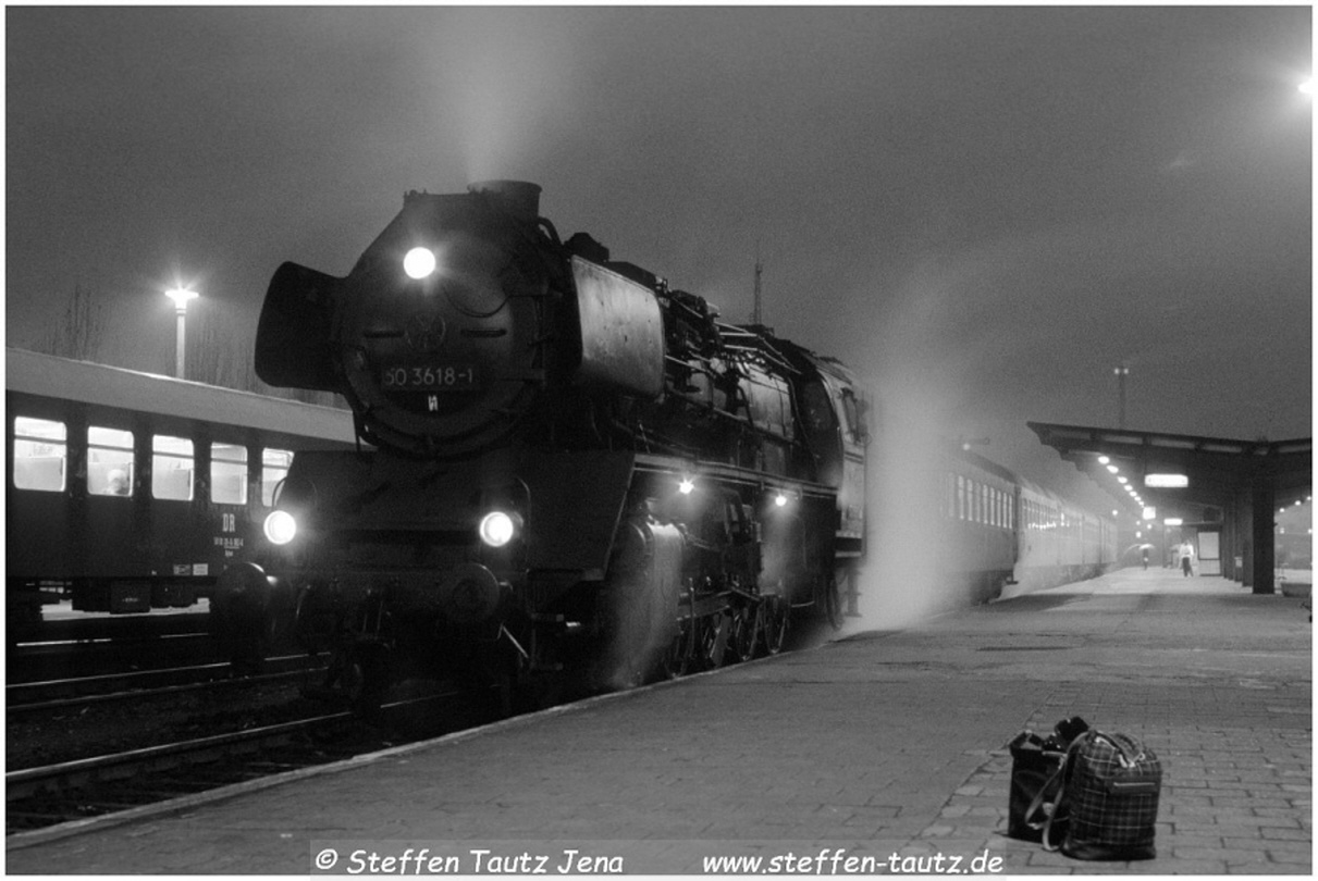 50 3618 mit dem P-Zug nach Aschersleben, Herrenloses Gepäckstück würde heute zur Sperrung des ganzen Bahnhof führen Dez 85