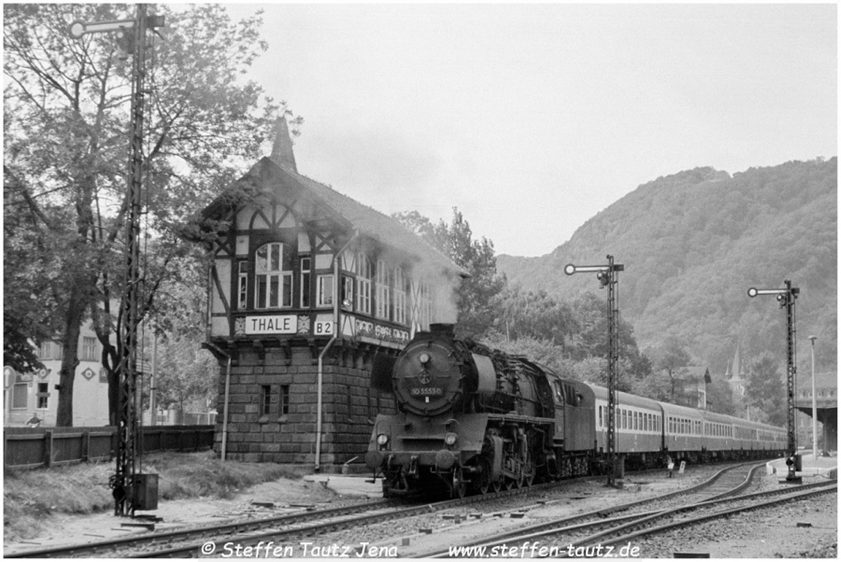 50 3553 mit P 19413 am Hausbahnsteig in Thale April 86
