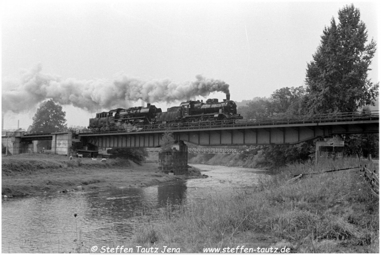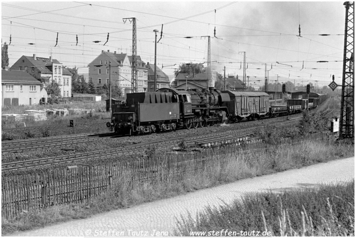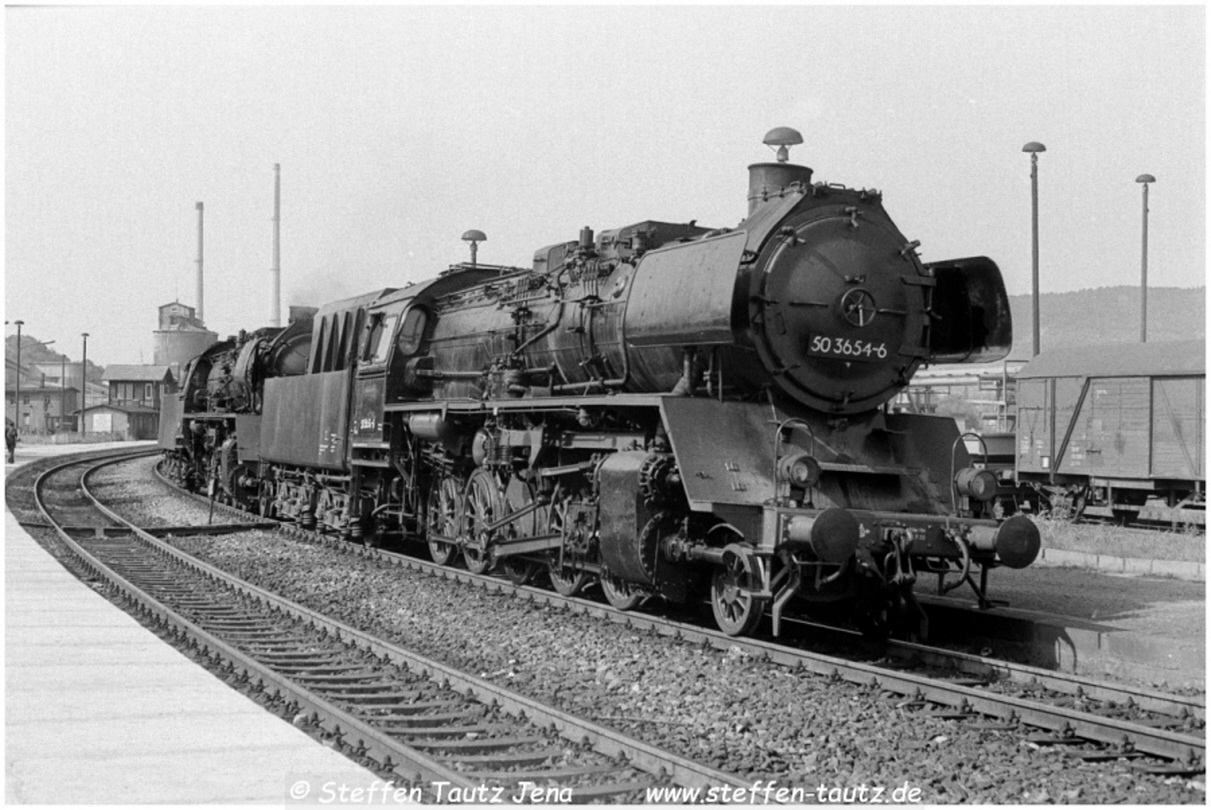 50 3654 und 50 3603 kommen aus dem RAW Meiningen auf dem Weg nach K-M-Stadt in Göschwitz Aug 83