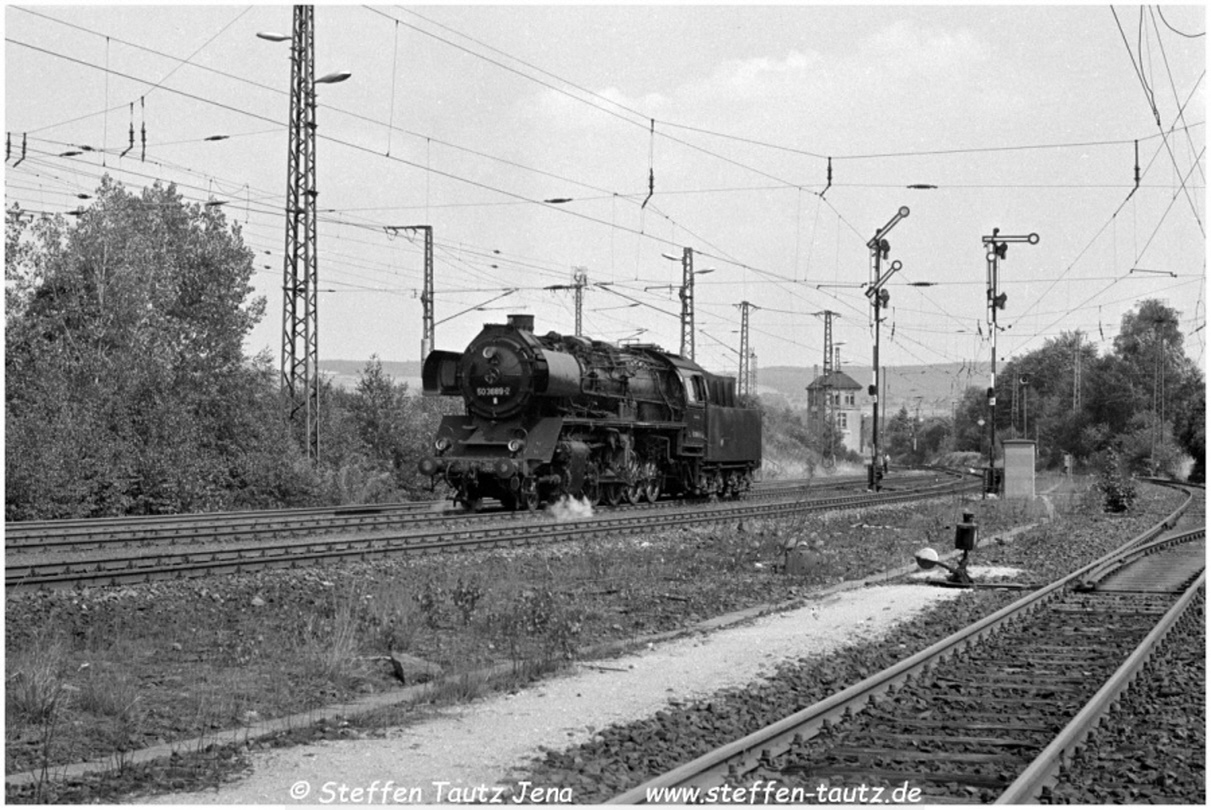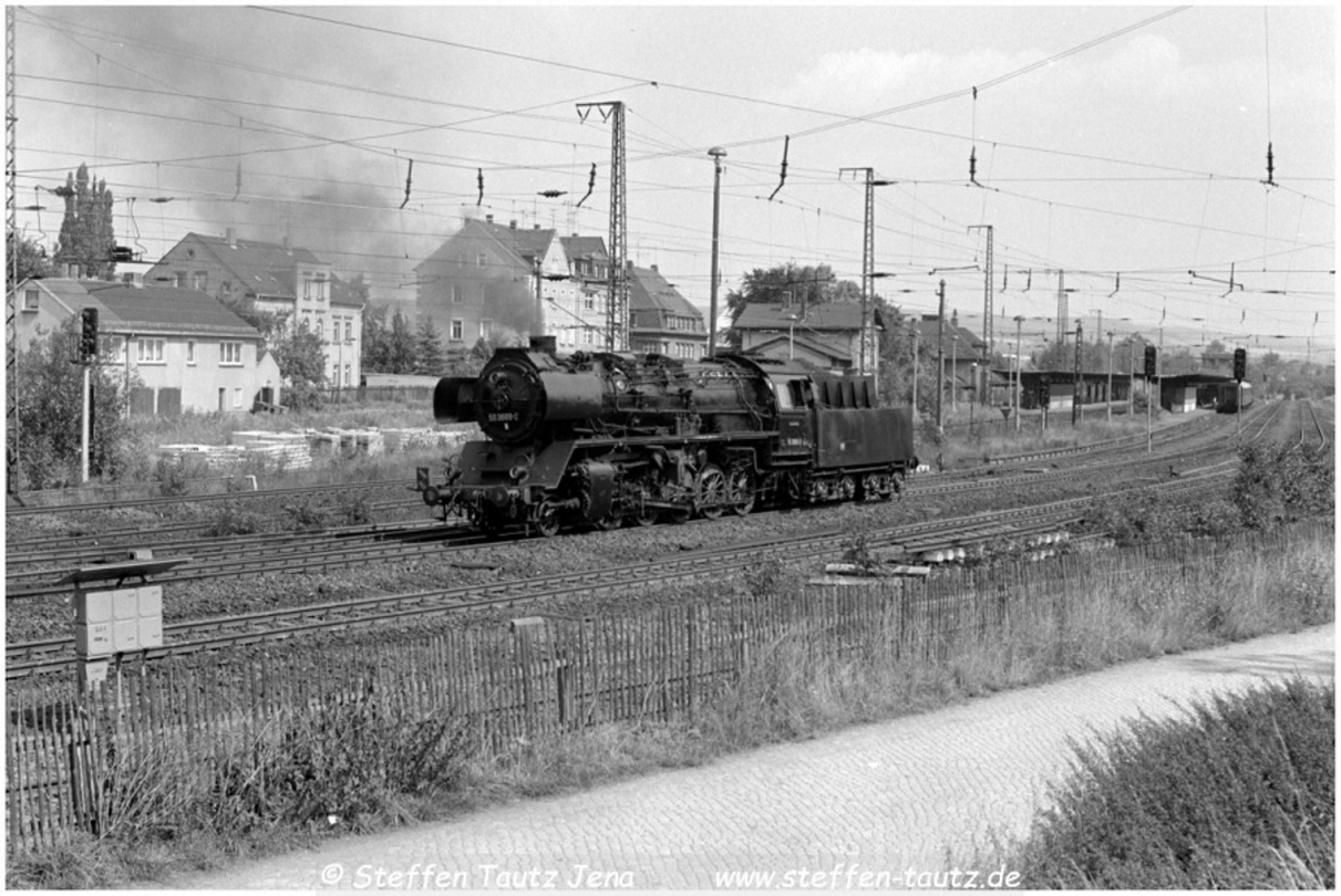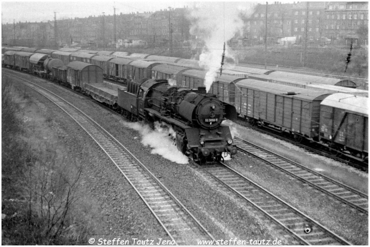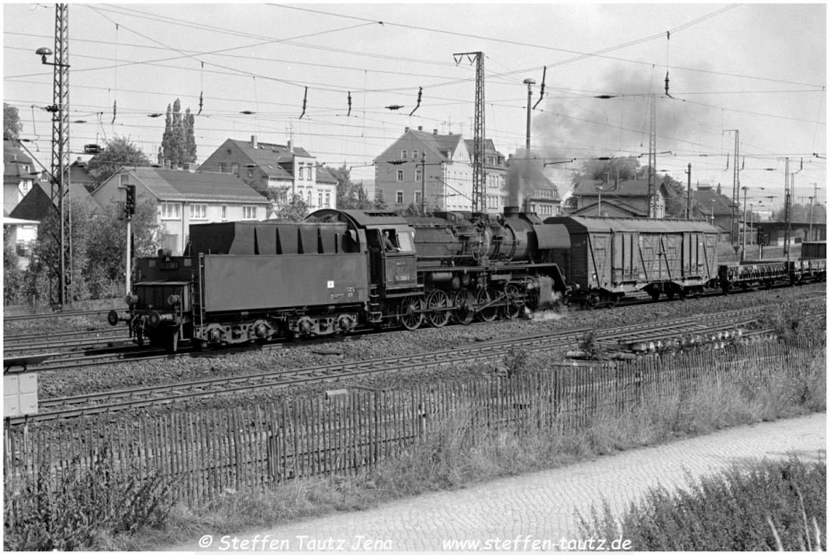 50 3654 und 50 3603 kommen aus dem RAW Meiningen auf dem Weg nach K-M-Stadt in Göschwitz Aug 83