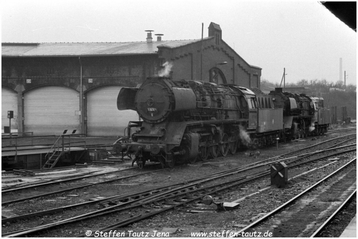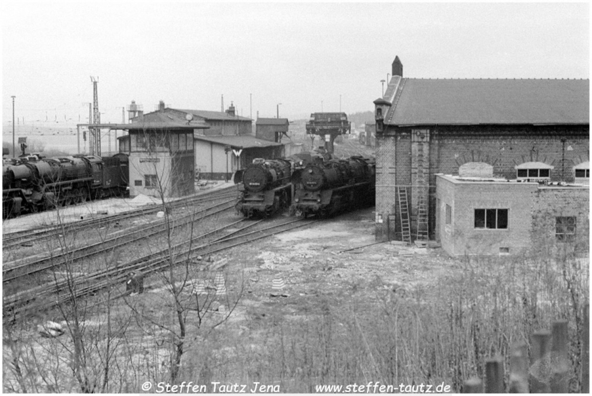 Mit einer 102 wird die kalte 50 3690 im Bw umgesetzt.44 1393 und 44 1351 kamen frisch vom Öl Rückbau aus Meiningen. Dez 83