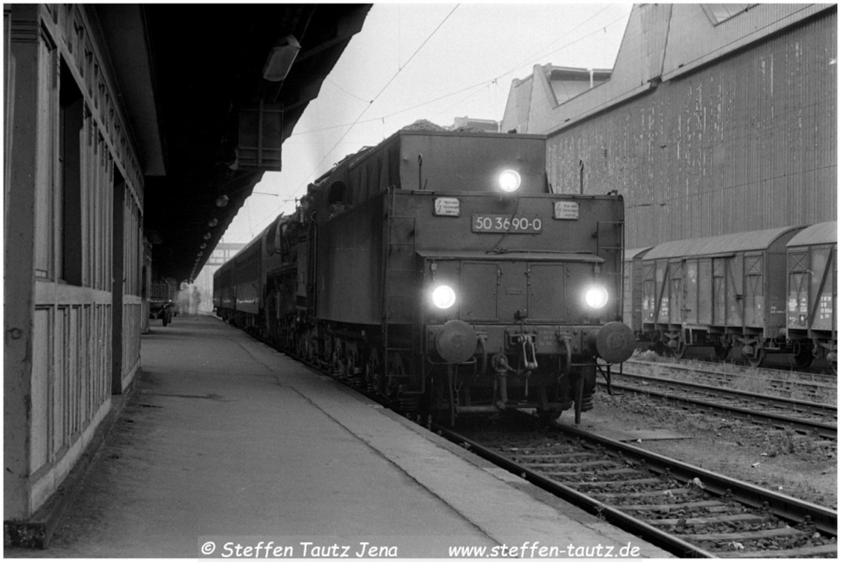 Das Bw Aue bespannte 2 Reisezüge Aue - K-M-St, hier 50 3690 am Hauptbahnhof Aug 86