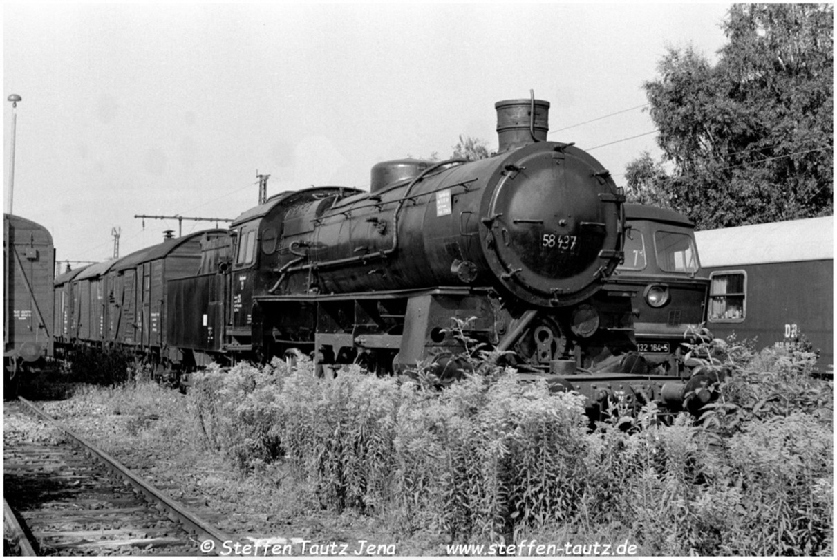 58 437 als Dampfspender auf der Durchreise vom RAW Meiningen nach Dresden im Bw K-M-St Hilbersdorf Mai 85