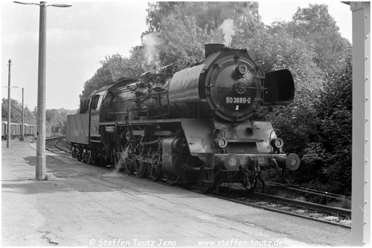 In Braunsdorf Lichtenwalde wartet 50 3689 als Lz auf die Weiterfahrt nach Hilbersdorf Juli 85
