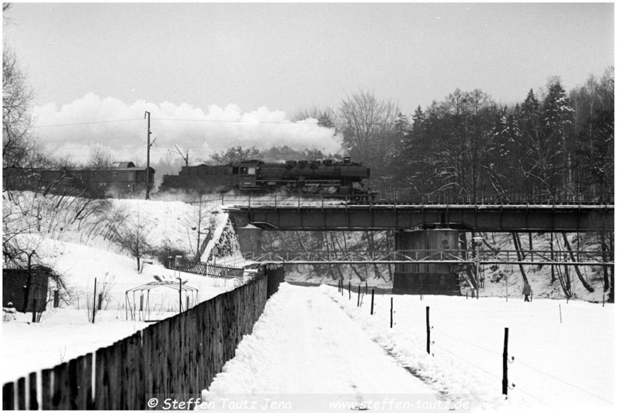 Während 50 3689 wieder zum Nahgüterzug nach Berbersdorf das Bw verlässt, grüßt das Pockauer Personal. Dez 83