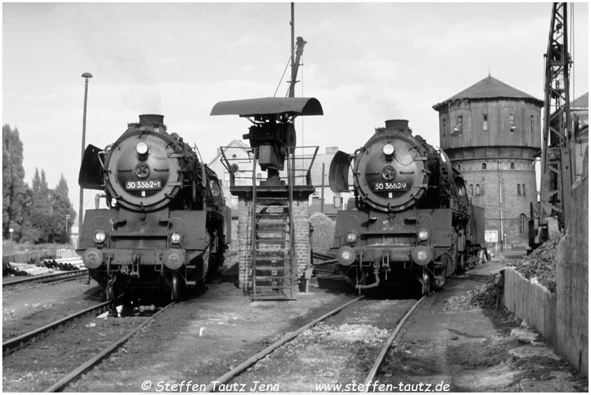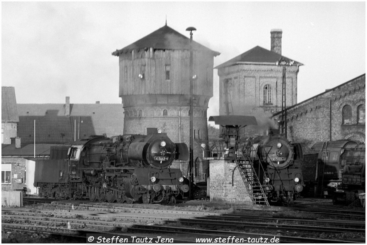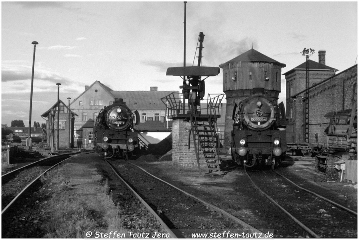 Im Abendlicht sonnten sich 50 3662 und 50 3606 im Bw Oschersleben Mai 88