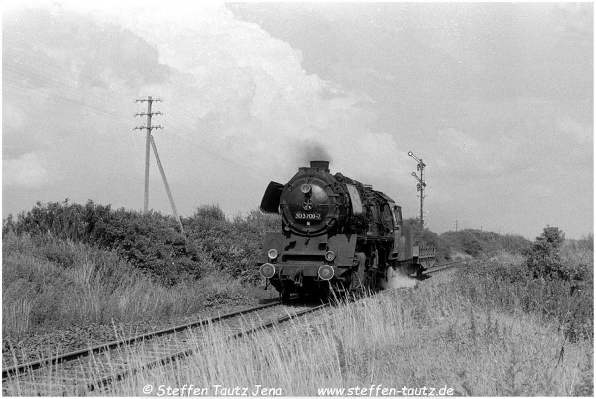 50 3700 steht auf Reserve im Gbf Oschersleben als 50 3705 an ihr in Richtung Halberstadt vorbei fährt Juli 87