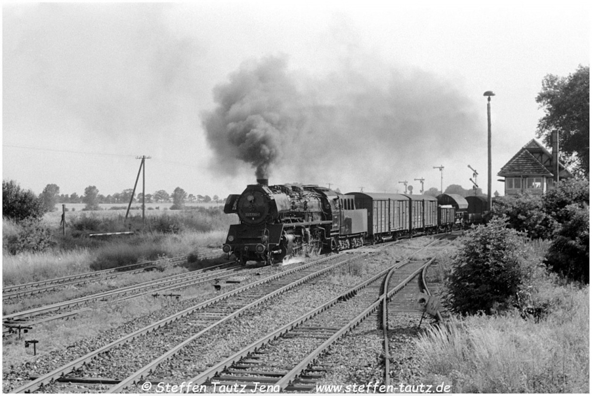 Hier hat 50 3705 mit N 61744 die Abzweigstelle Wolfsfelde passiert, wo die Güterstrecke von Buckau in die Personenzugstrecke einfädelt Juli 87