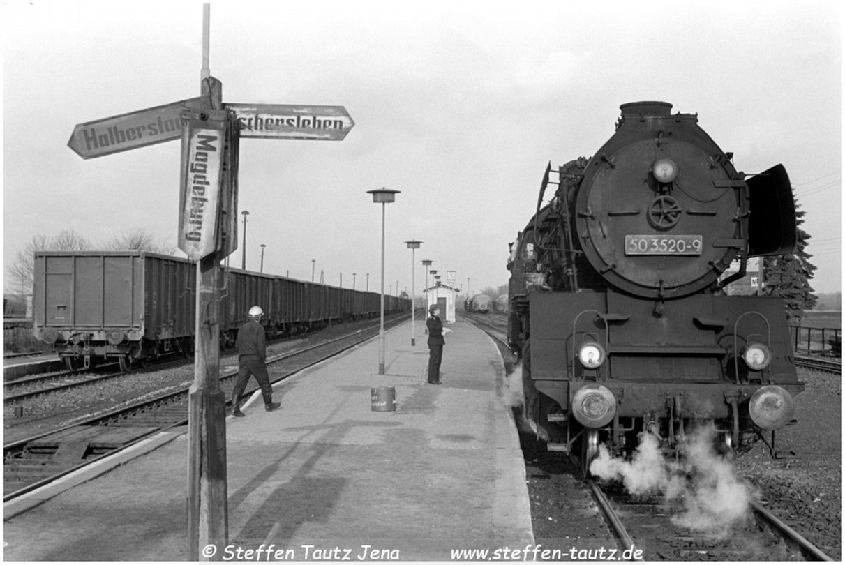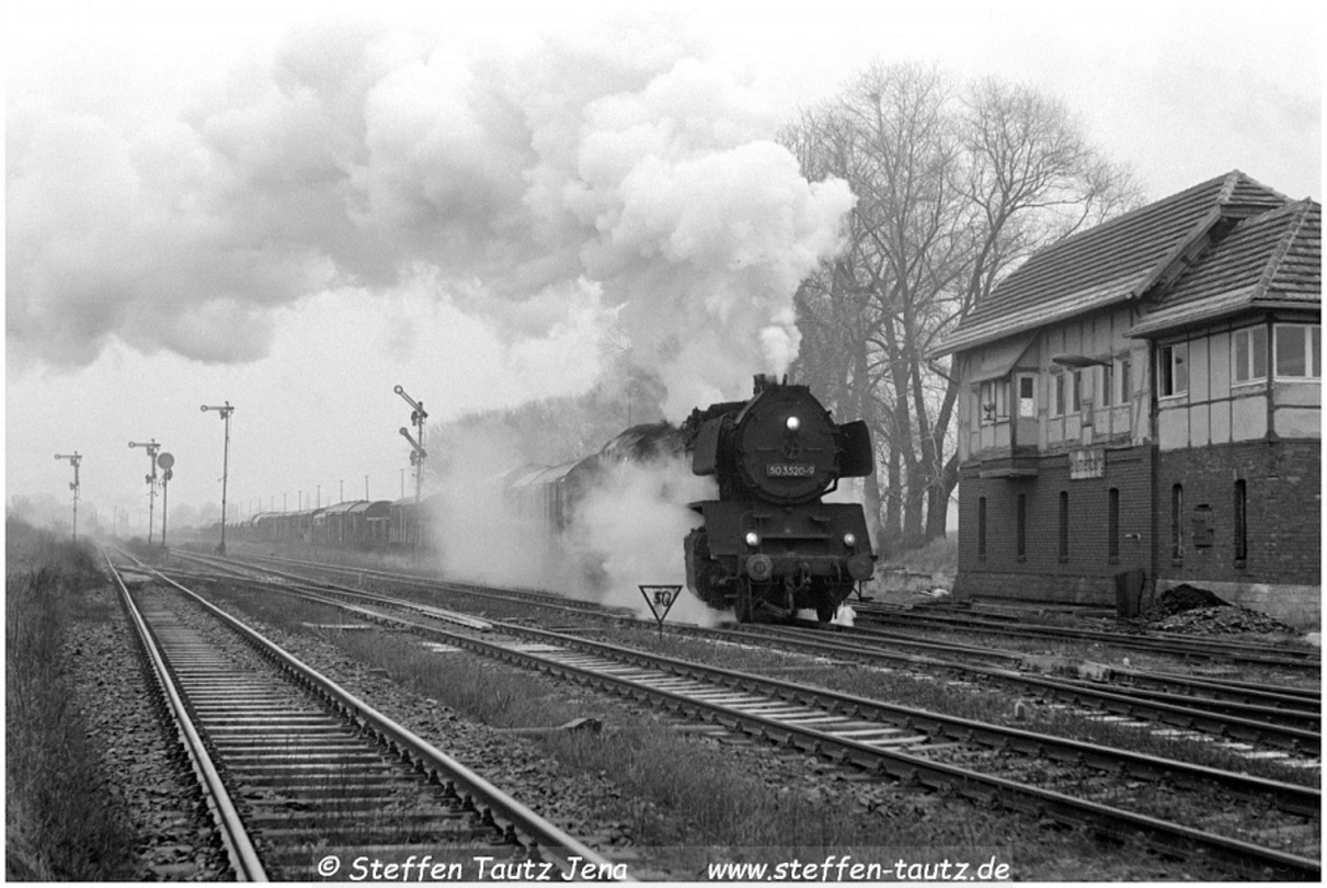 50 3520 ist Lz aus Oschersleben in Nienhagen angekommen und wartet auf den Zug aus Dedeleben, der an diesem Tag mit BR 114 bespannt war Feb 88
