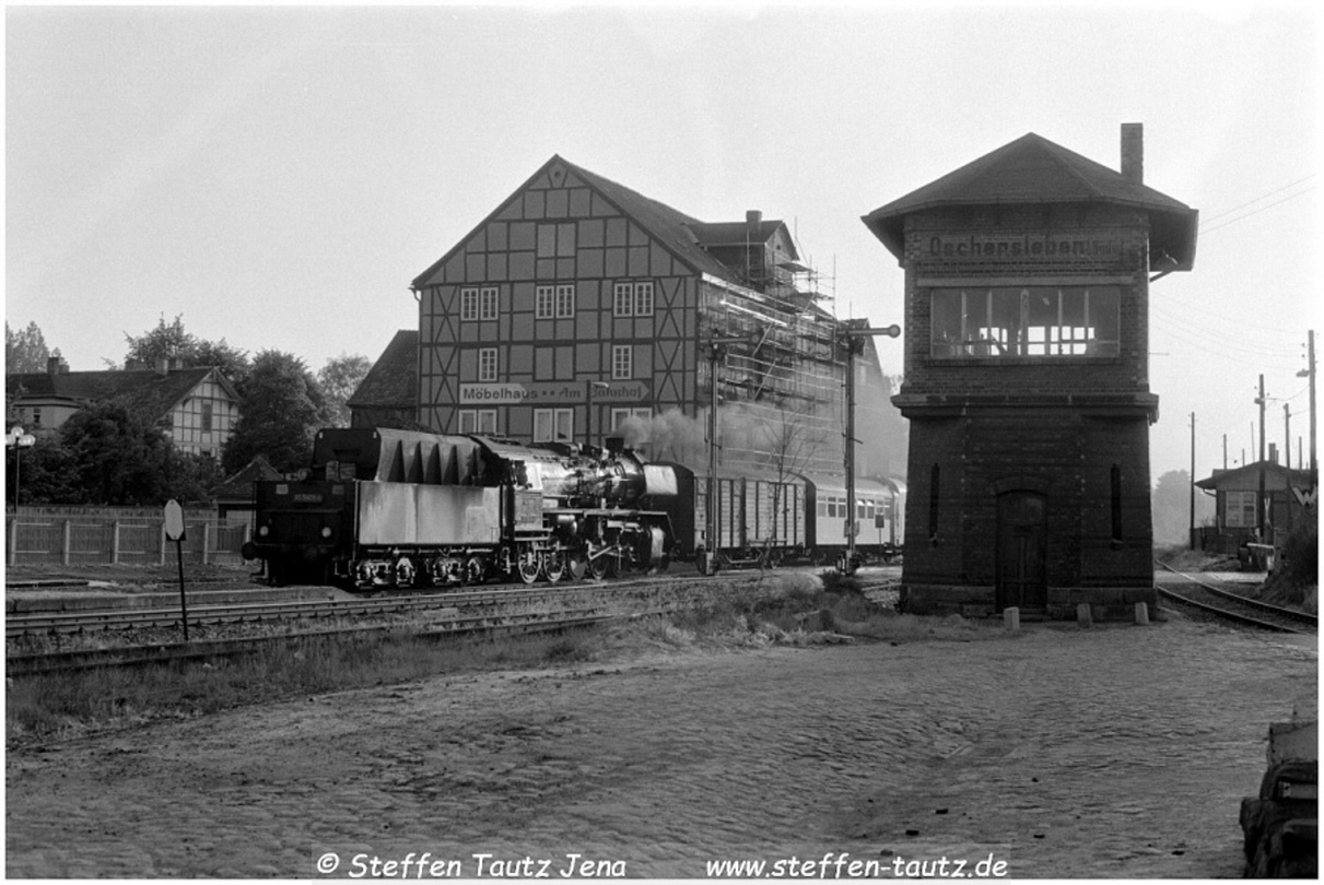 Abends fuhr ein Kurzpendel nach Nienhagen vom Bahnsteig 0 in Oschersleben ab, planmäßig Dampfbespannt. Hier 50 3556 mit diesem Zug Feb 88